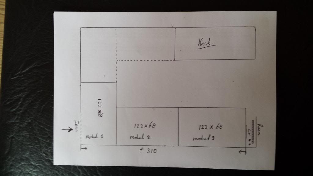 de 3 modules met de maten op de schets daar ga ik mee beginnen want die heb ik al klaar liggen en waar niks op staat dat worden de andere 2 modules van 122 x68 dus een totale treinbaan lengte van 6m10