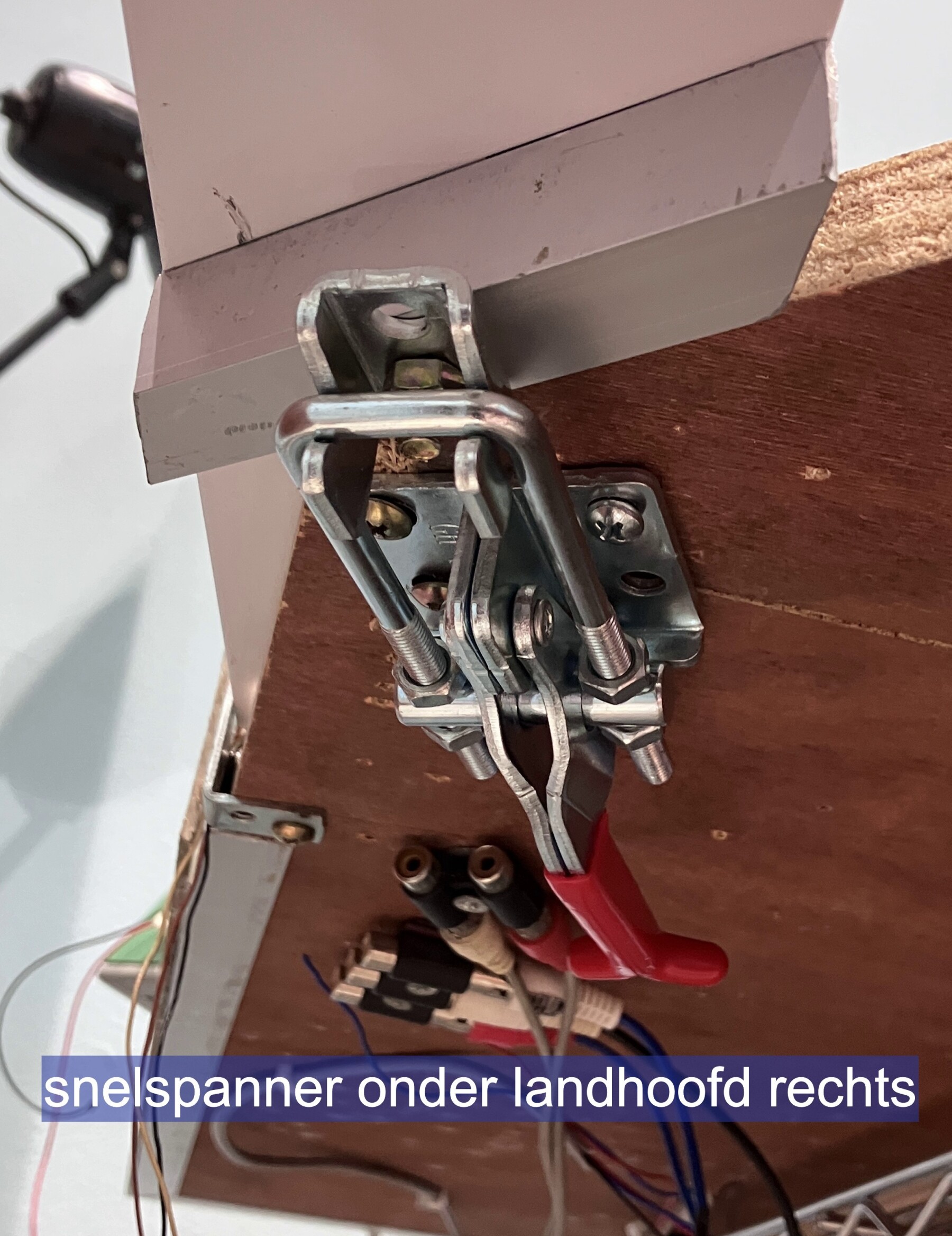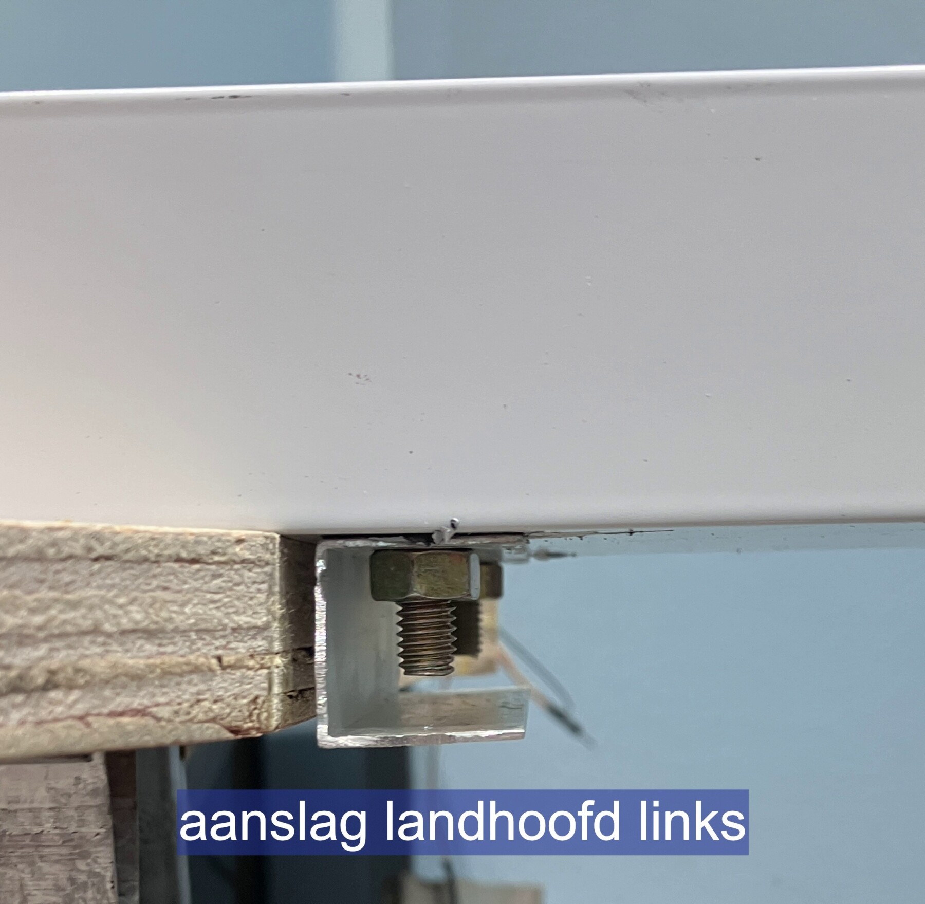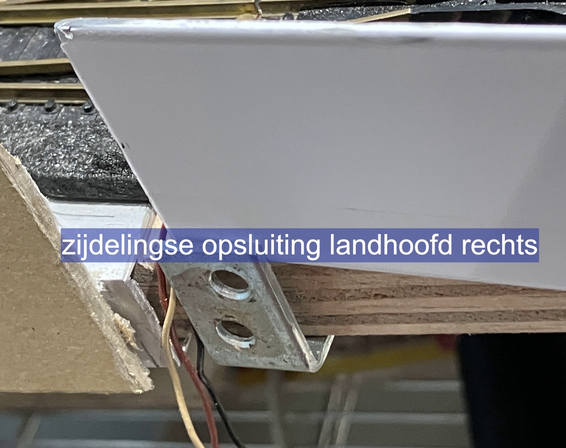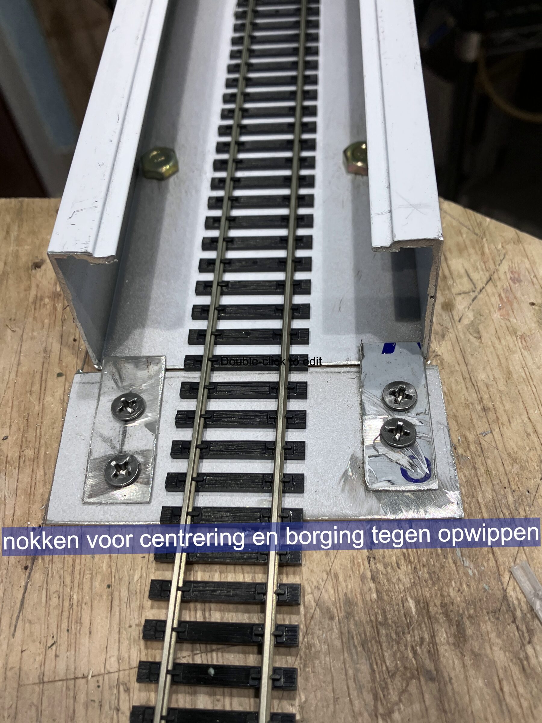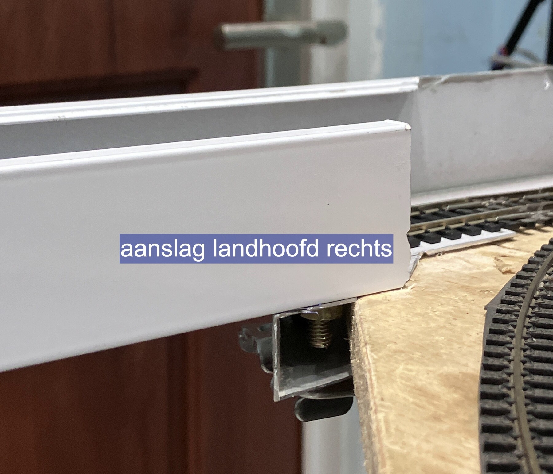 Aan de linkerkant nokken op de tafel die de brug zijdelings opsluit en borgt tegen opwippen.