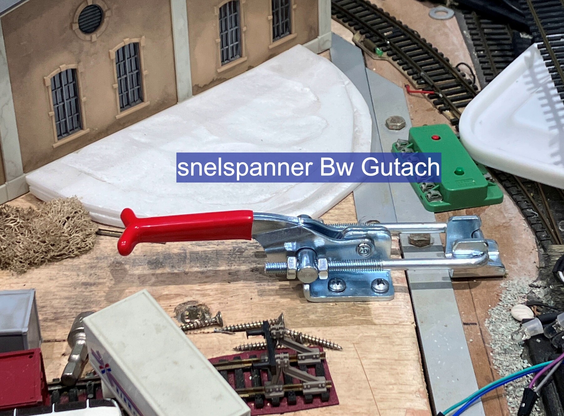 Ik heb 4 snelspanners tussen de tafels onderling toegepast: twee voor de koppeling van het ravennaviaduct met de tafel links en rechts van het viaduct, een spanner onder de trogbrug en een spanner voor de koppeling van de tafel Bw Gutach en de tafel van station Lz.