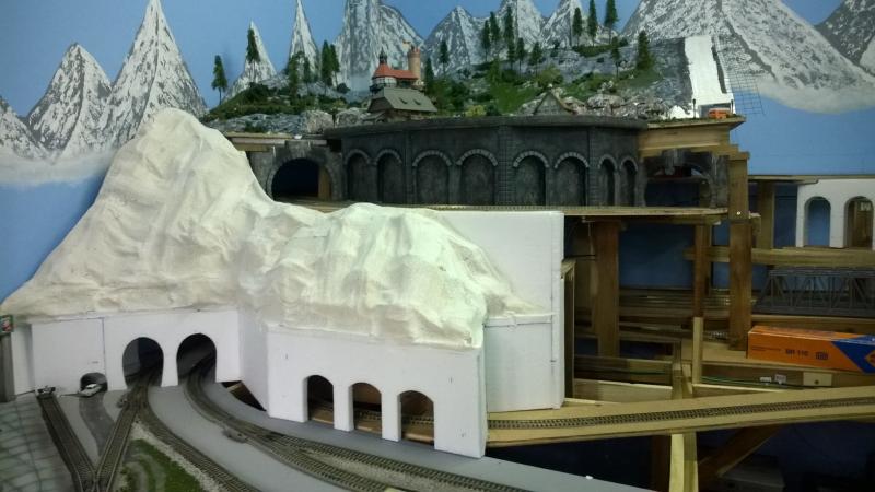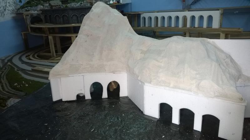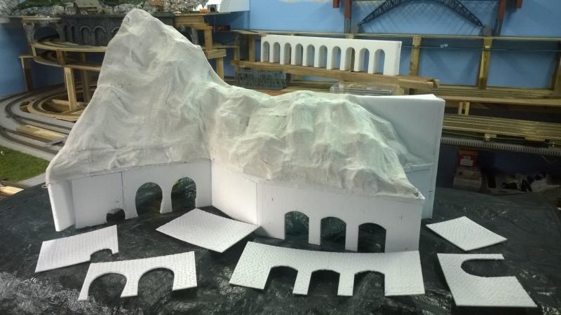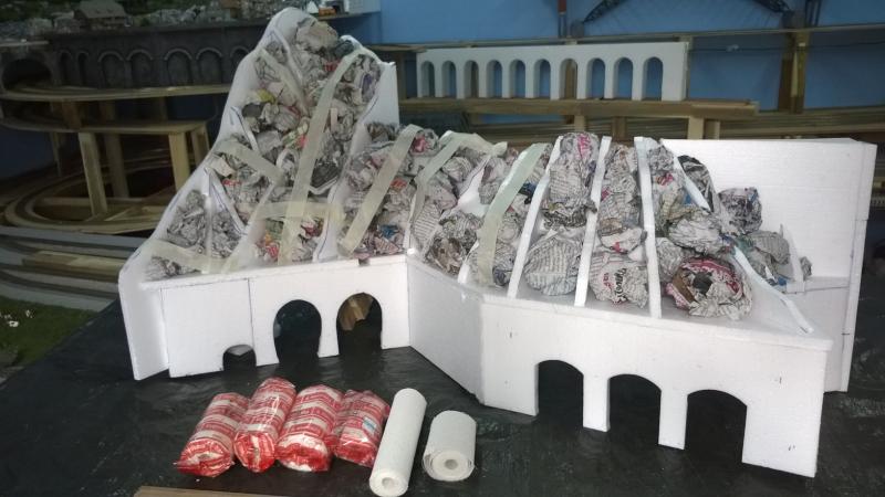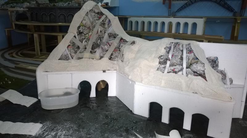 De werkwijze is een beetje anders dan de linker bergtop. Aangezien dit gedeelte veel kleiner is gebruik ik geen gaas maar kranten om de berg te vormen.
