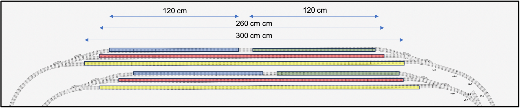 Het schaduwstation heeft 6 sporen. 2 daarvan worden gesplitst zodat er 2 kortere treinen op 1 spoor kunnen staan.
