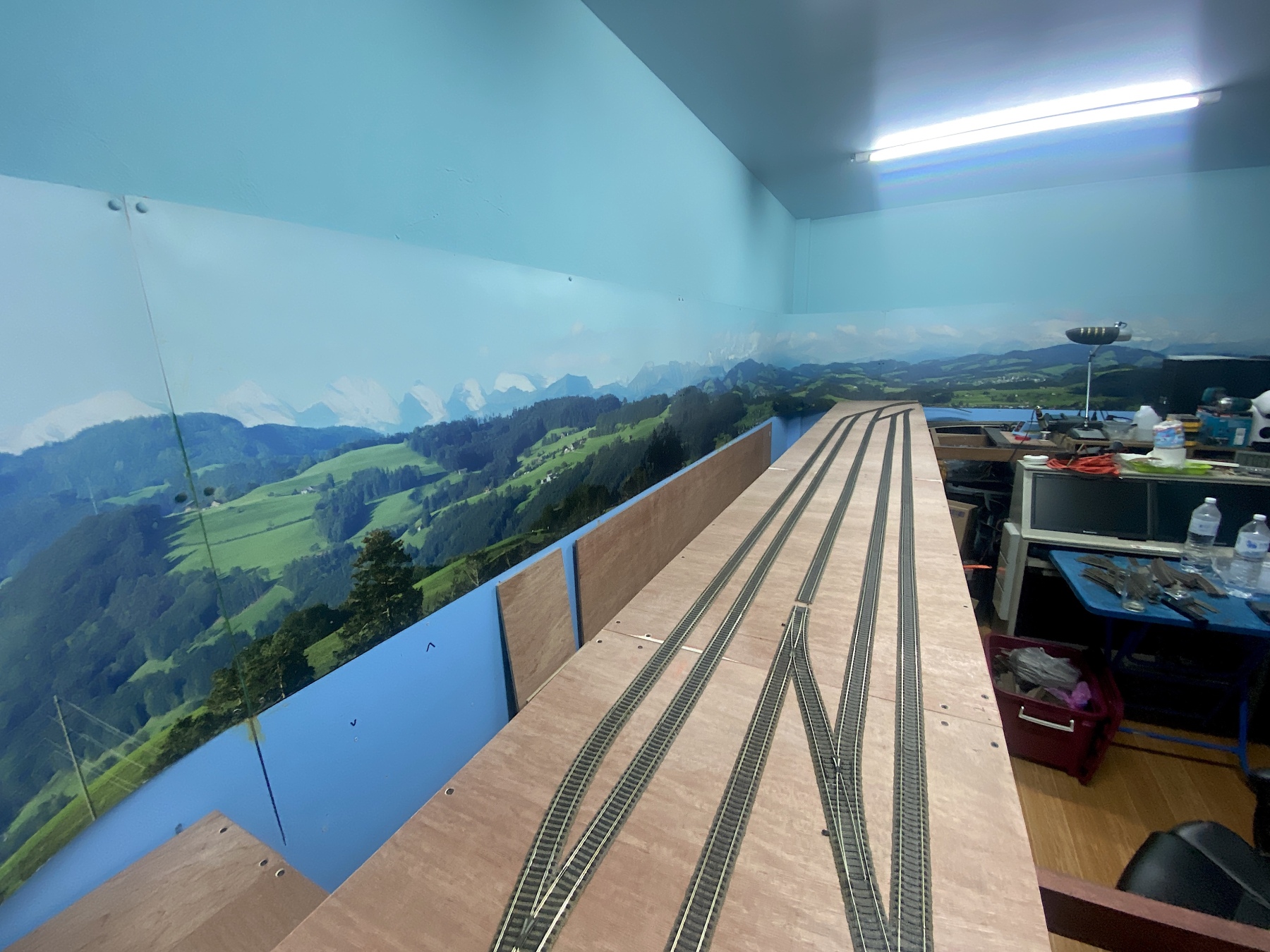 Vandaag even de rails neer gelegd om te kijken hoe het oogt. Toch nog een kleine verandering aan gebracht zodat het middelste spoor niet zo ver van spoor 2 en 4 af ligt.
