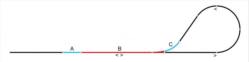 Trein rijdt via A en B rechtdoor de keerlus in. Als de lok over sectie C rijdt worden secties A en B omgepoold en de wissel gaat om.