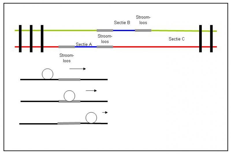 PS Het stroomloos stukje moet volgens mij dan iets groter zijn dan de afstand van de assen in het draaistel.