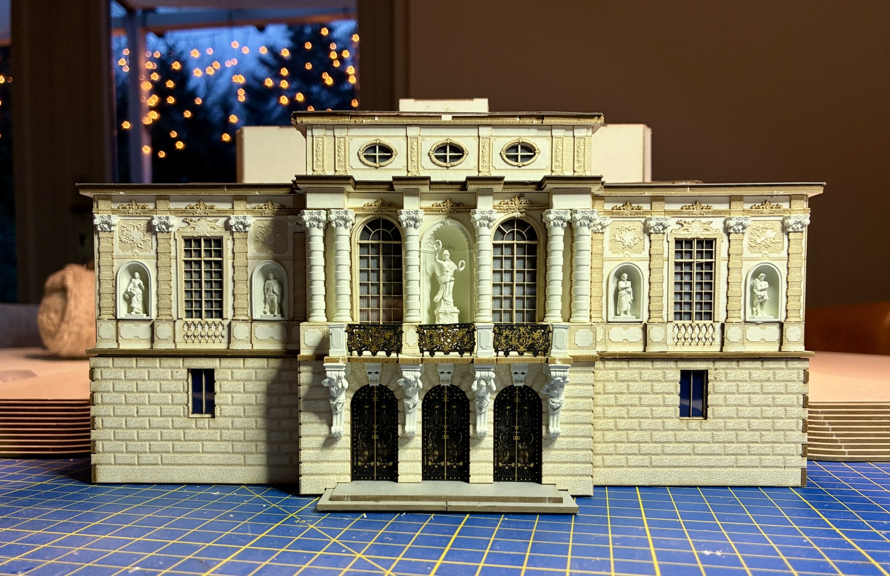 Nee het ding is op kleur.Karton en MDF als basis en papier ( lijkt het wel) op de bovenste etages.Dus al zou ik die hoeken hebben geschuurd, blijf het veel donkerder.