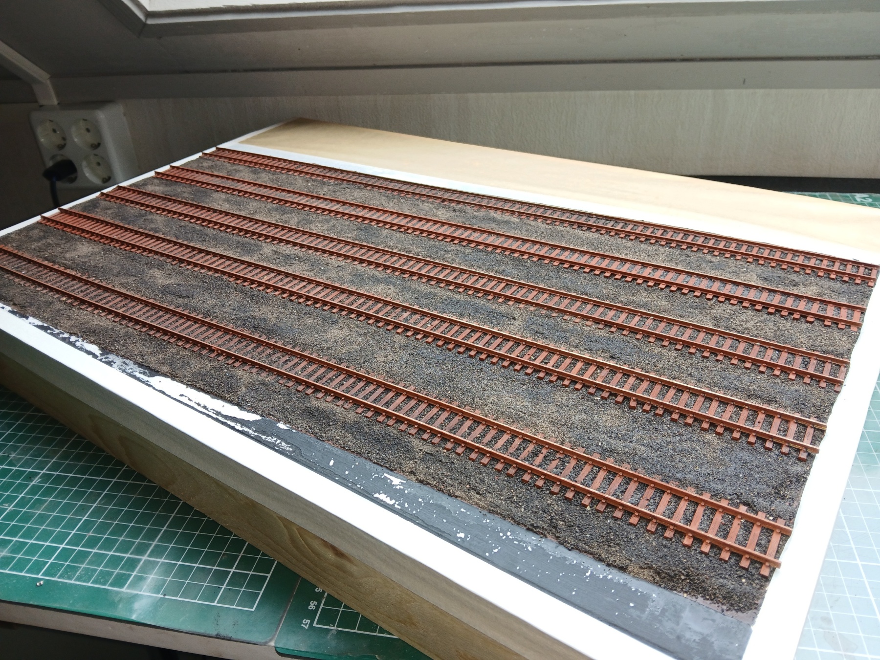 Ik had al eens een klein stukje proefballast gestrooid, maar dat was me voor een emplacement véél te grof, dus er weer afgeweekt.