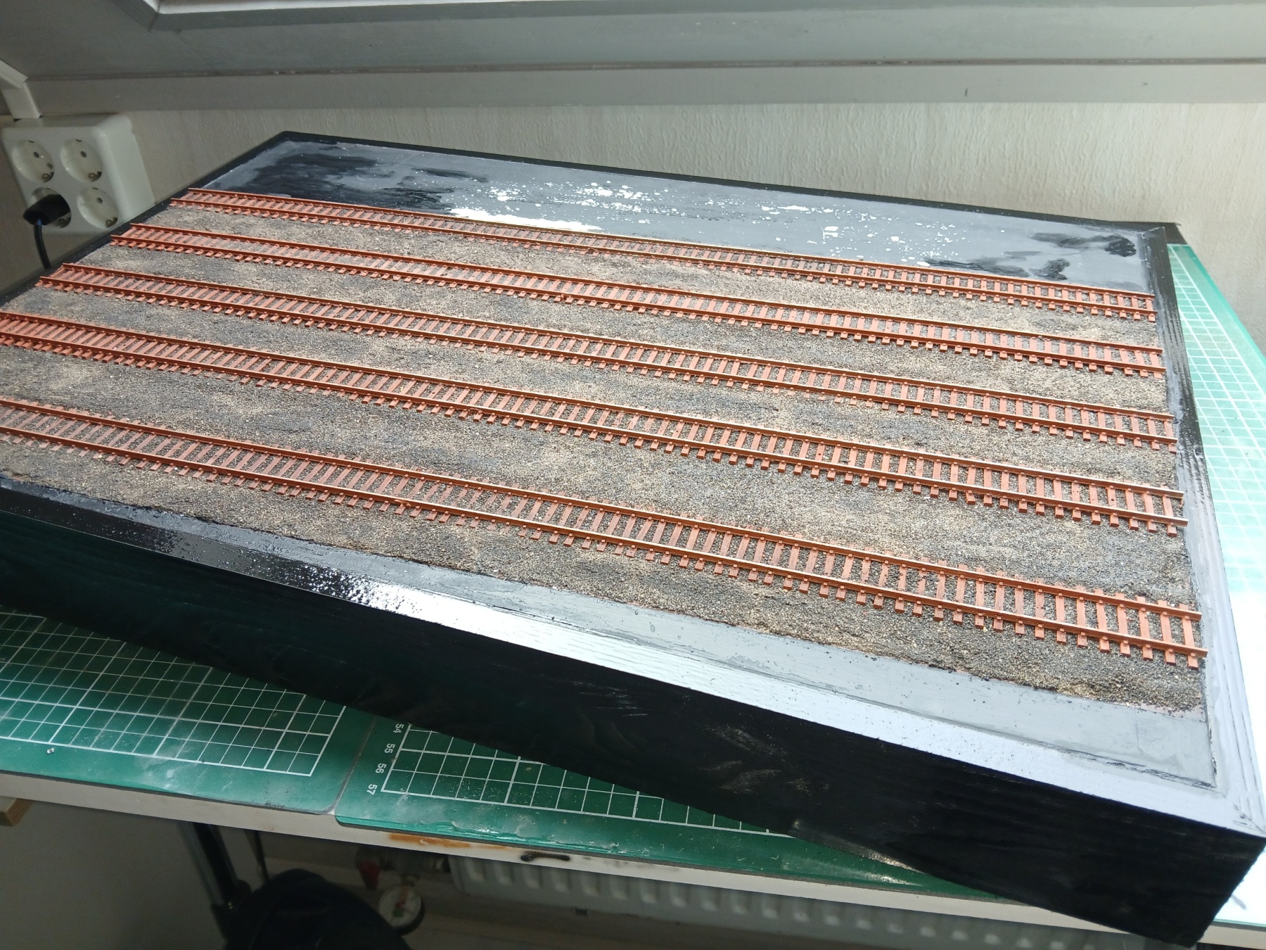 Het diorama is omrand, de rails liggen er op en gaatjes voor de bedrading zijn geboord.