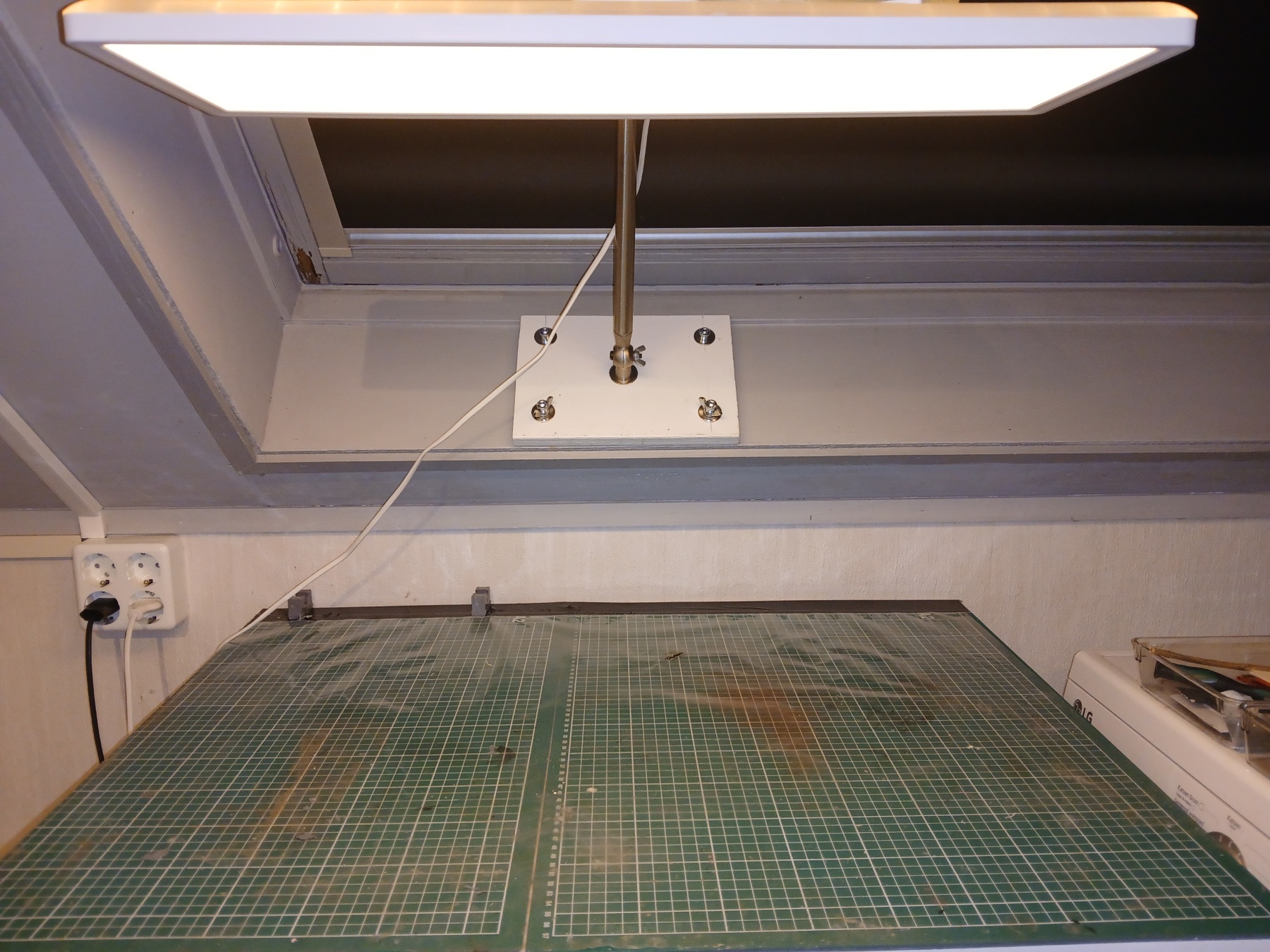 Met een LED bakje van de Action en een grondig verbouwde arm van een bureaulamp uit de kringloopwinkel een wegneembaar lichtpunt gemaakt boven wat normaliter mijn daglichtwerkplek is.