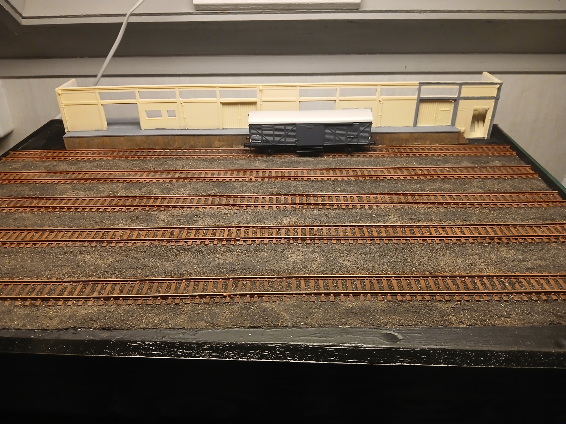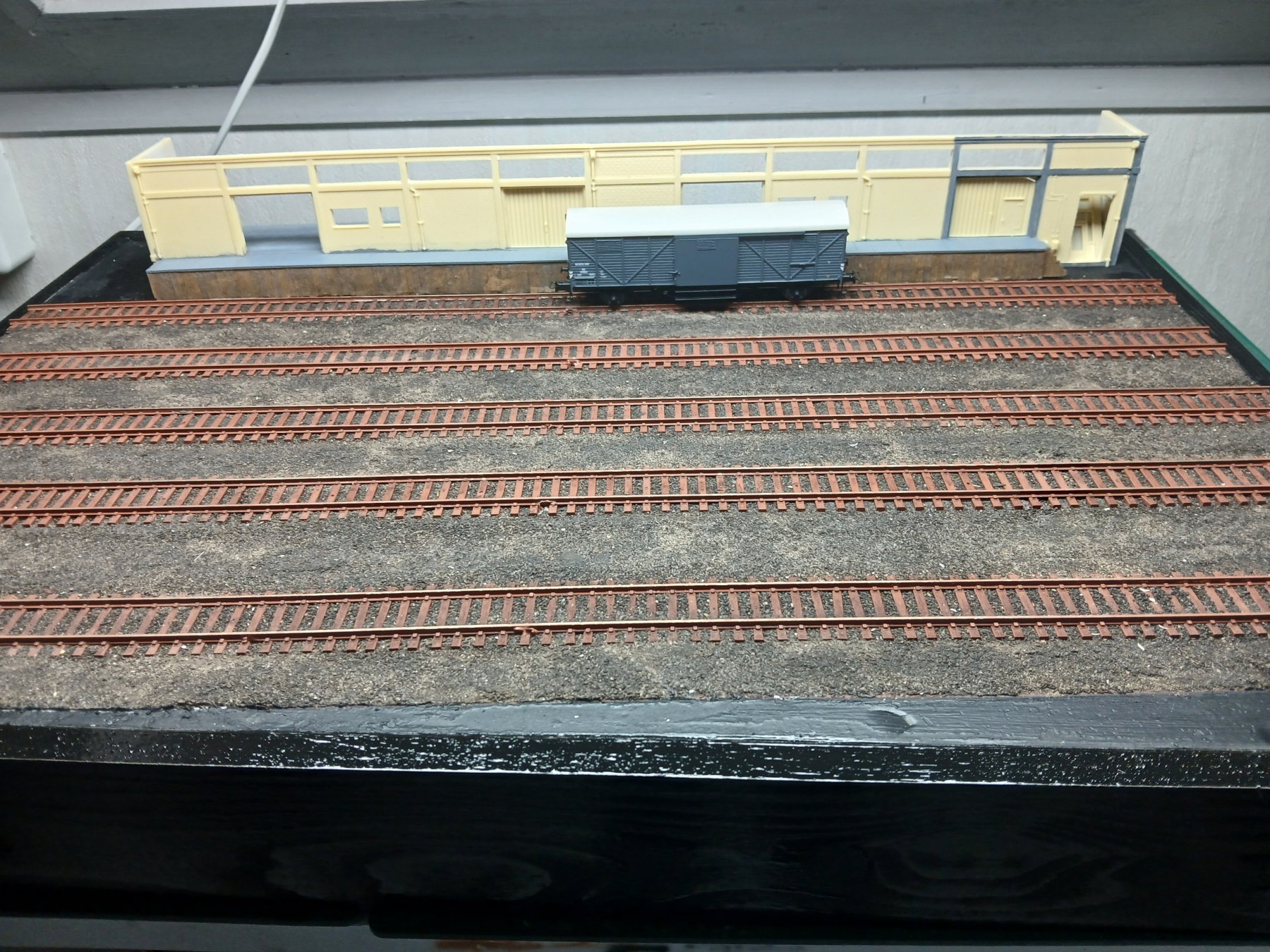 Het houtwerk onder het laadperron een kleurtje gegeven met 2 washes, eerst bruin en daarna nog meer verdund zwart.