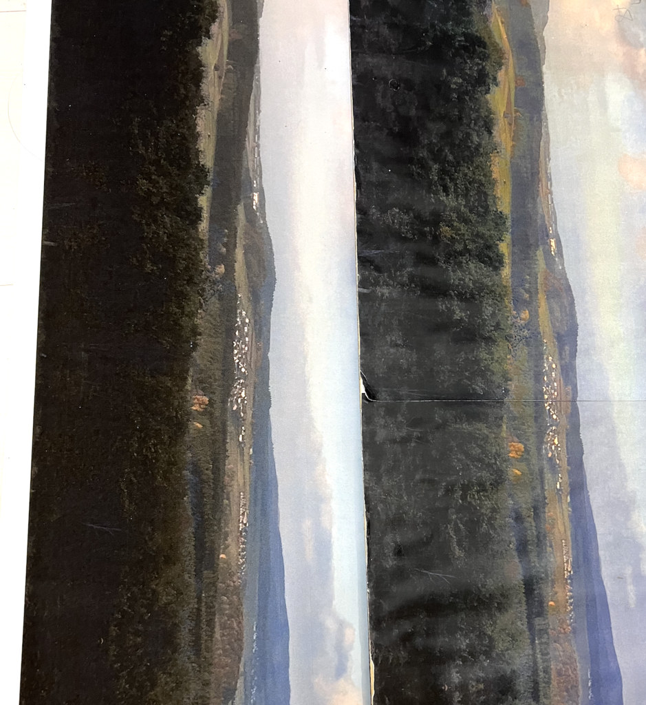 Achtergrond op maat snijden. Oude en nieuwe naast elkaar. Het viel me wat tegen dat de bomenrij merkbaar donkerder was, zonder veel tekening. De rest van de achtergrond beviel me beter dan de oude. Onder andere wat scherper en wat lekkerder kleuren: