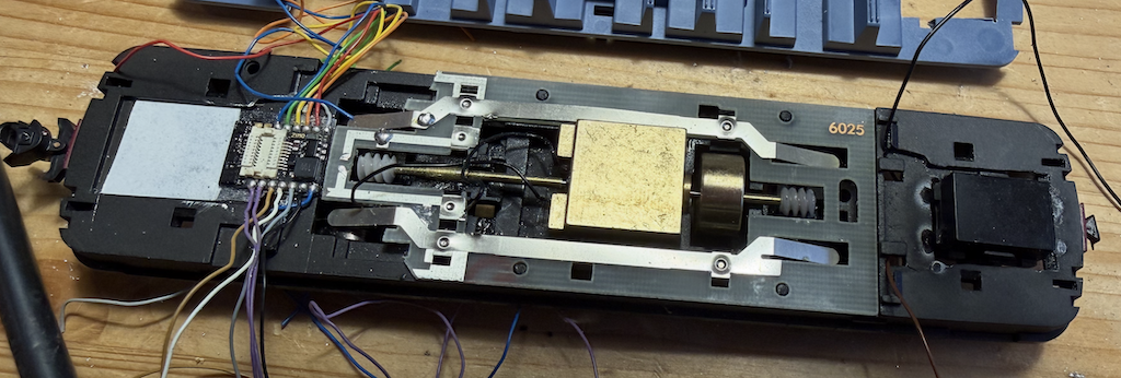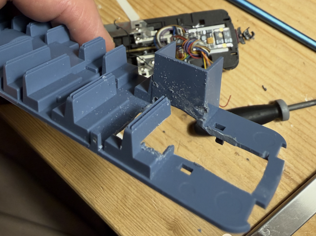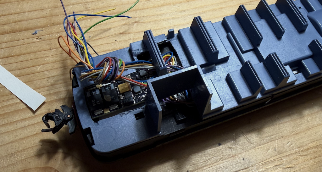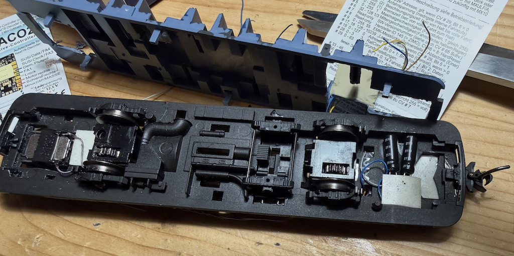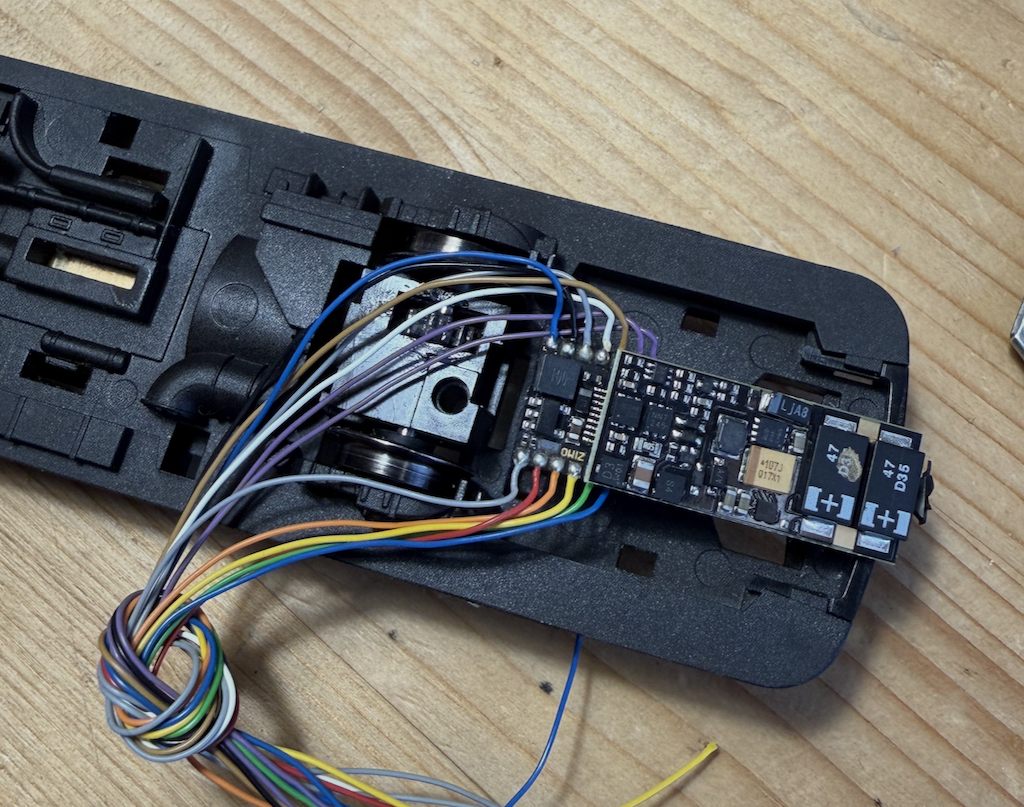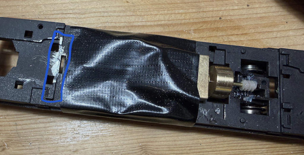 Motor eruit en een ombouwset van SB Modellbau (klokankermotor) erin. Netjes volgens de handleiding tot aan de aanslag naar rechts drukken →