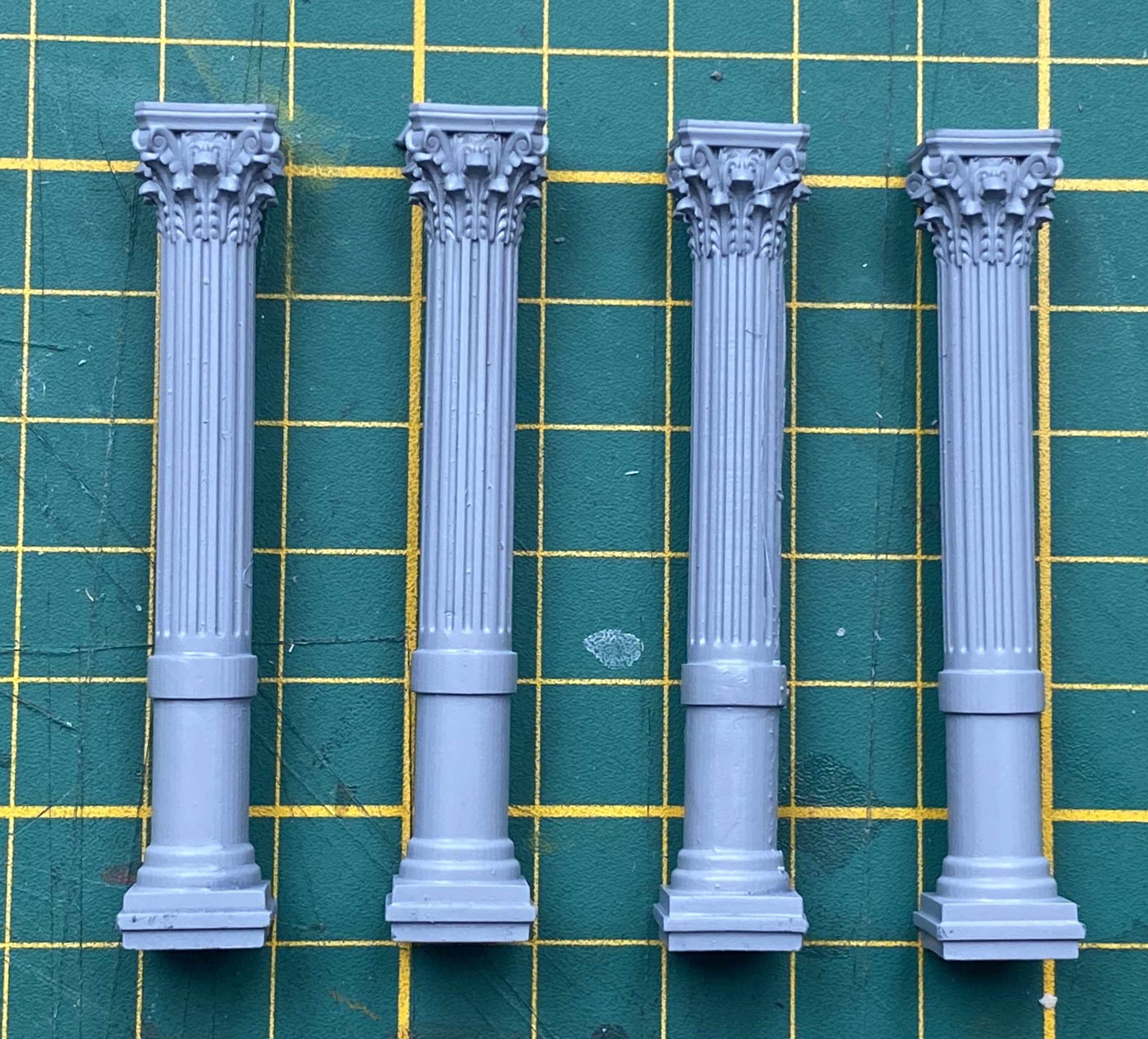 De pilaren geprint en een luchtverfje gegeven. Nu drogen en dan kunnen de oude pilaren (gewoon ronde buisjes met wat ringen) vervangen worden door deze mooiere exemplaren