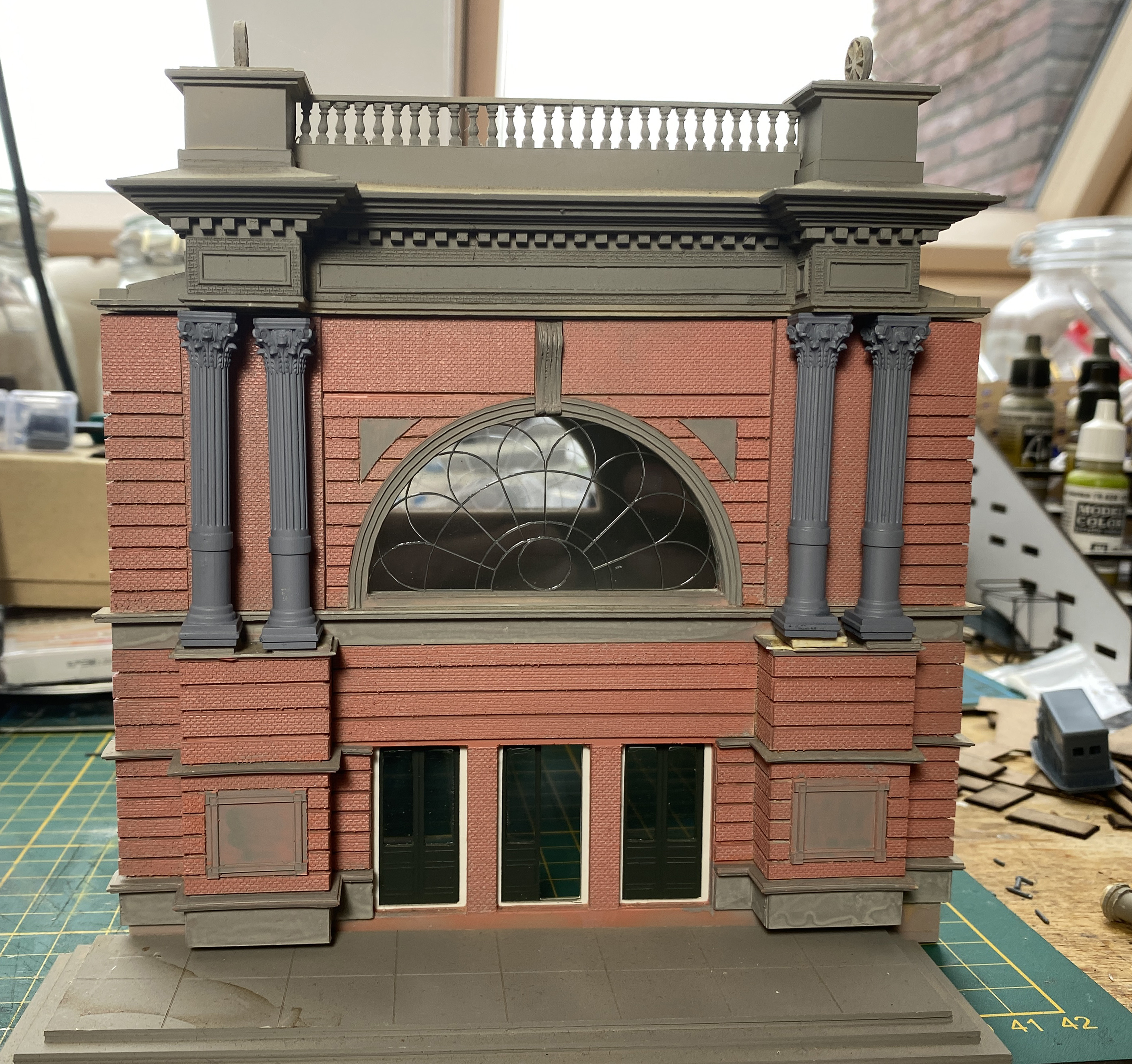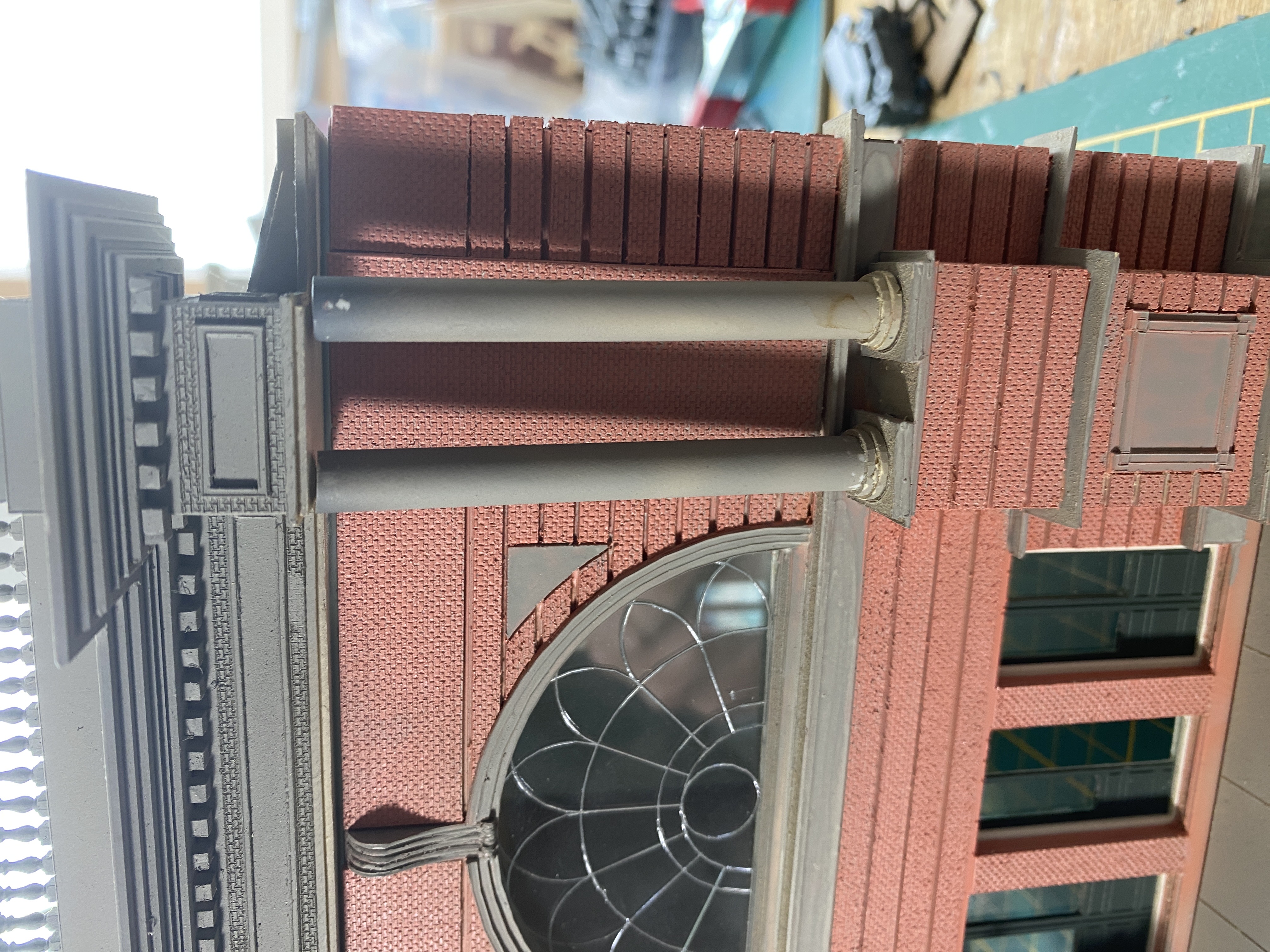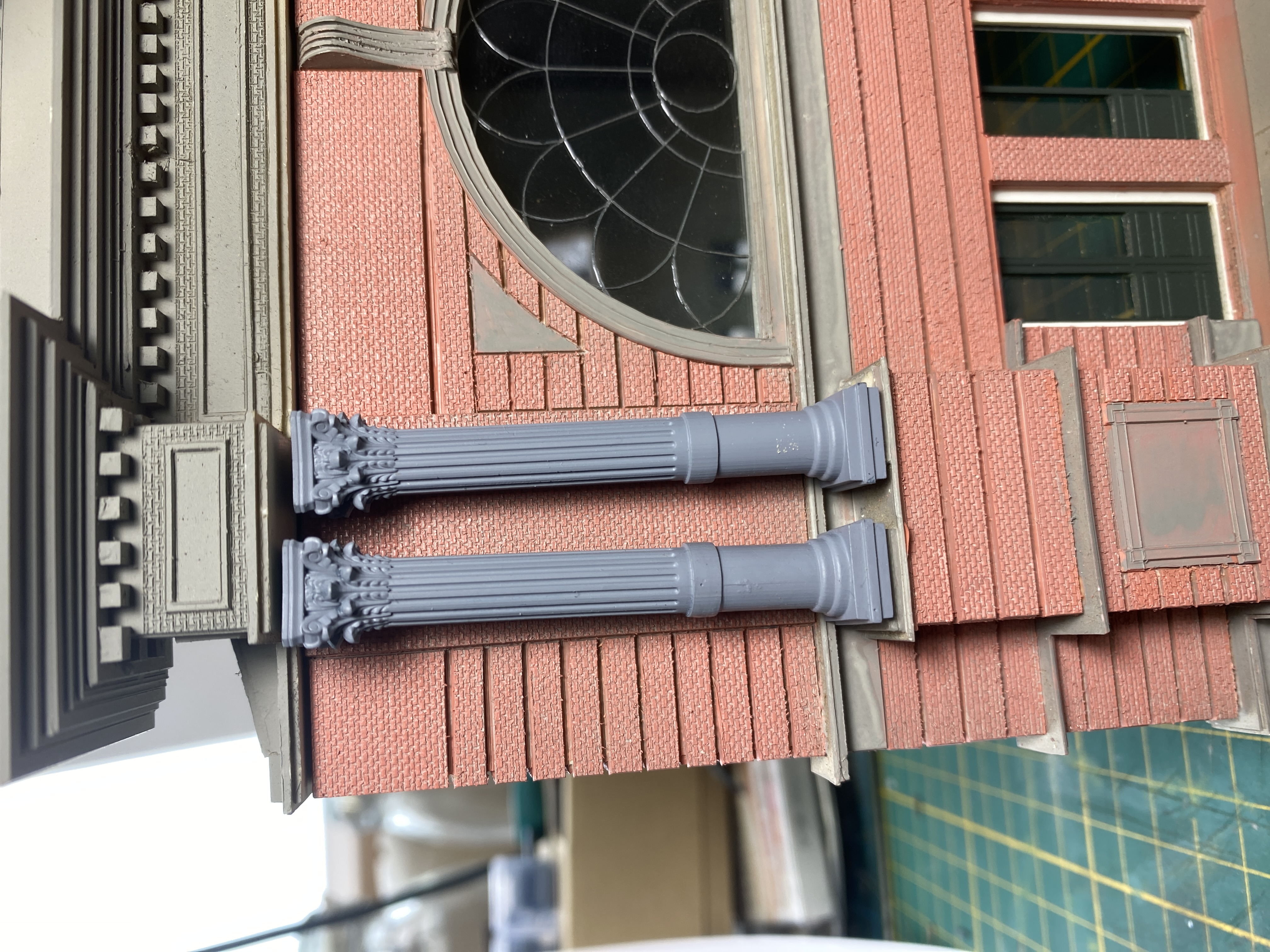 De pilaren geprint en een luchtverfje gegeven. Nu drogen en dan kunnen de oude pilaren (gewoon ronde buisjes met wat ringen) vervangen worden door deze mooiere exemplaren