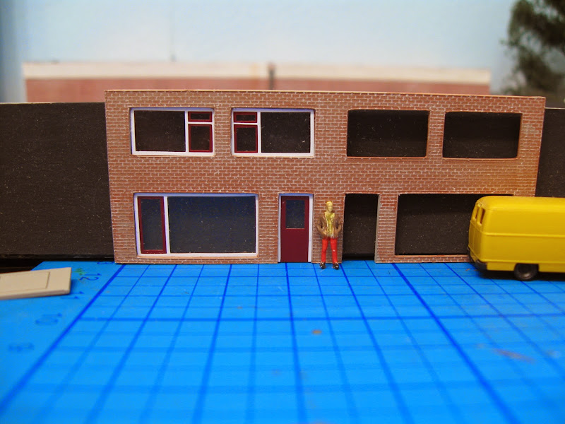 Ik plak trouwens de kozijnen direct op het doorzichtige folie. Het geheel plak ik dan tegen de wand. De passing is goed.