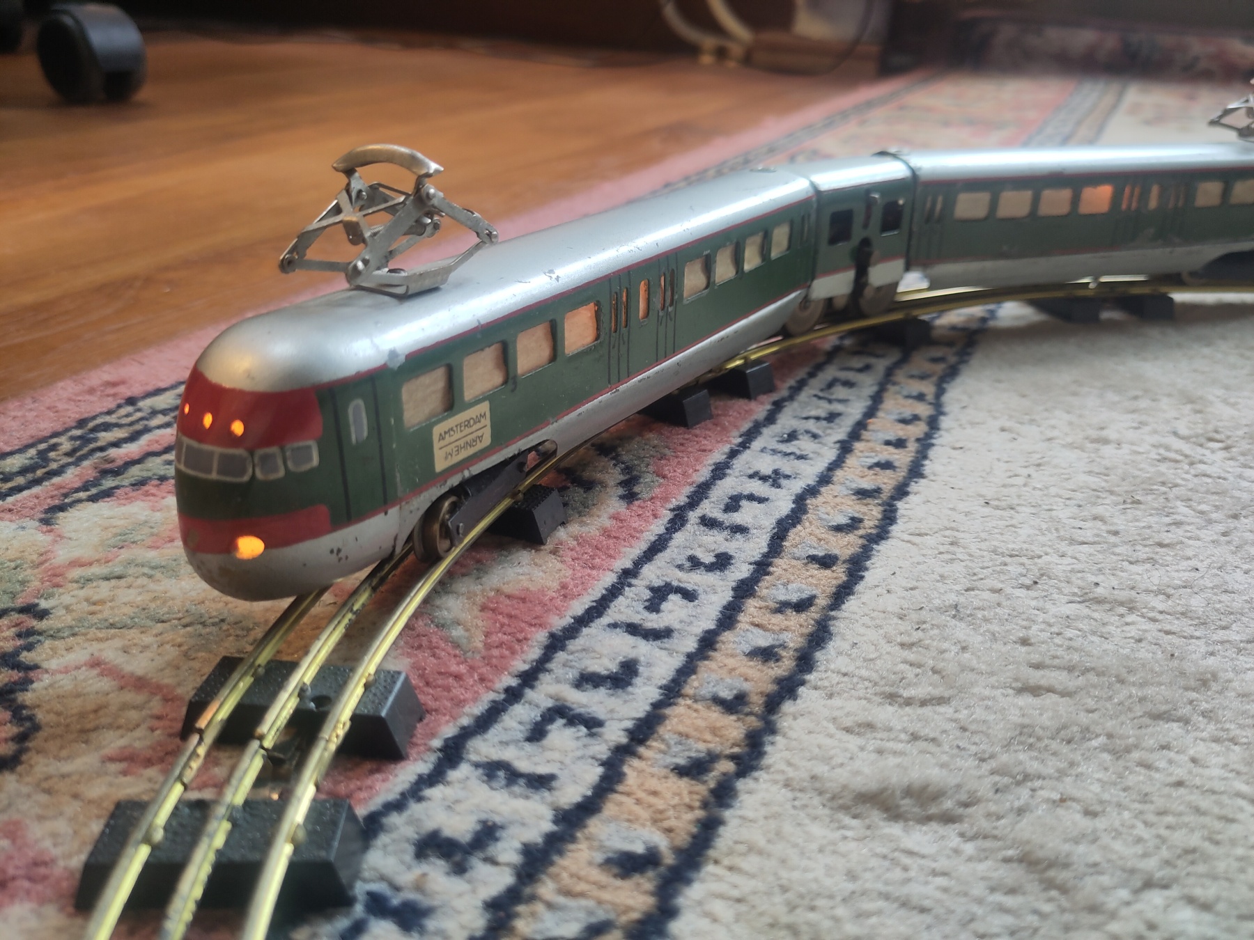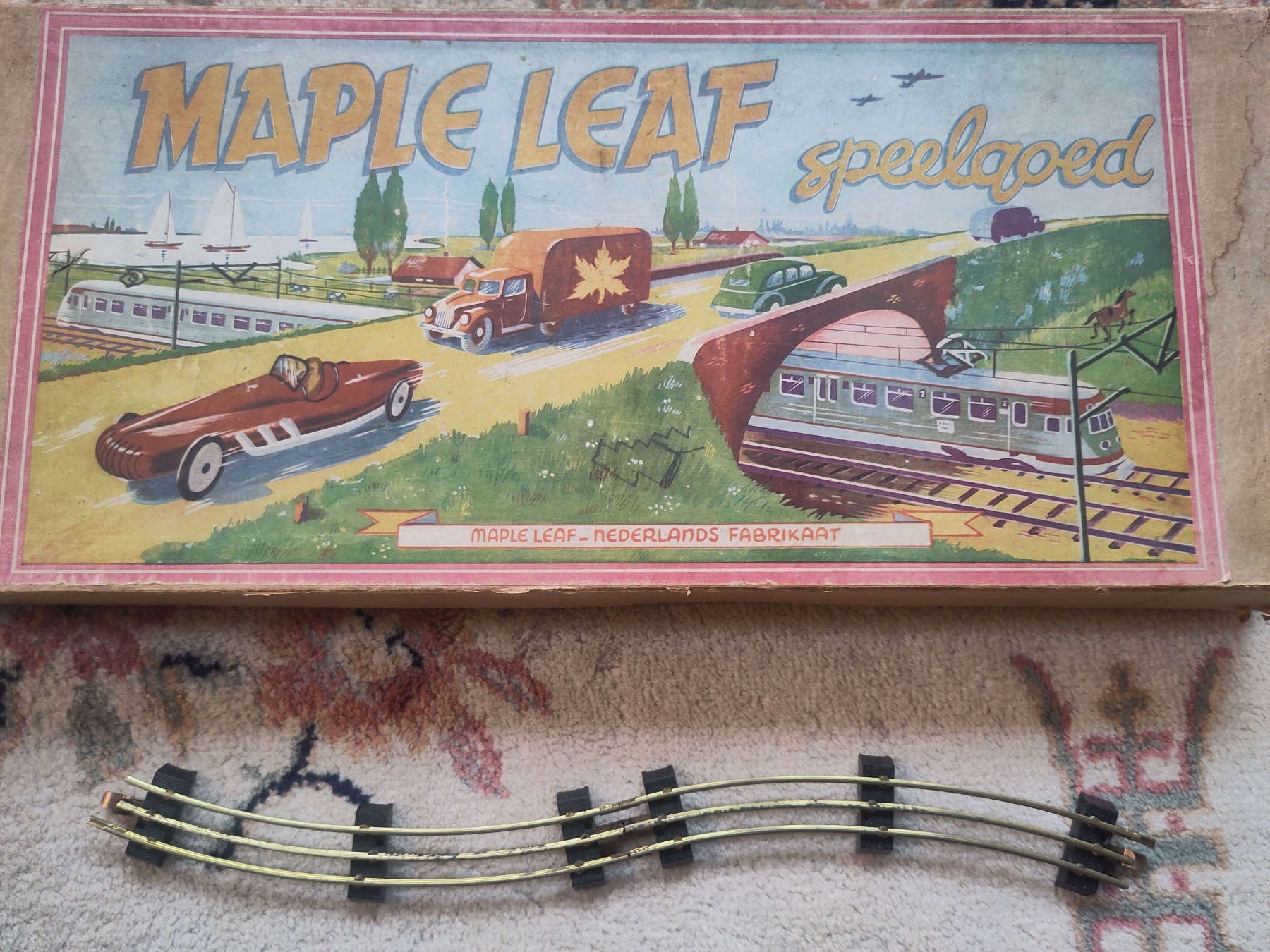 Van Rainer leerde ik dat mijn trein vermoedelijk kort na de oorlog in een kleine serie werd gemaakt in opdracht van de bekende winkelier Merkelbach uit Amsterdam. Ze werd verkocht met een cirkel rails onder de naam Maple Leaf. Dit vermoedelijk ter ere van onze Canadese bevrijders. Het treinstel heeft een onjuist middendeel, waarschijnlijk om het met de grote motor mogelijk te maken door krappe modelbochten te rijden.
