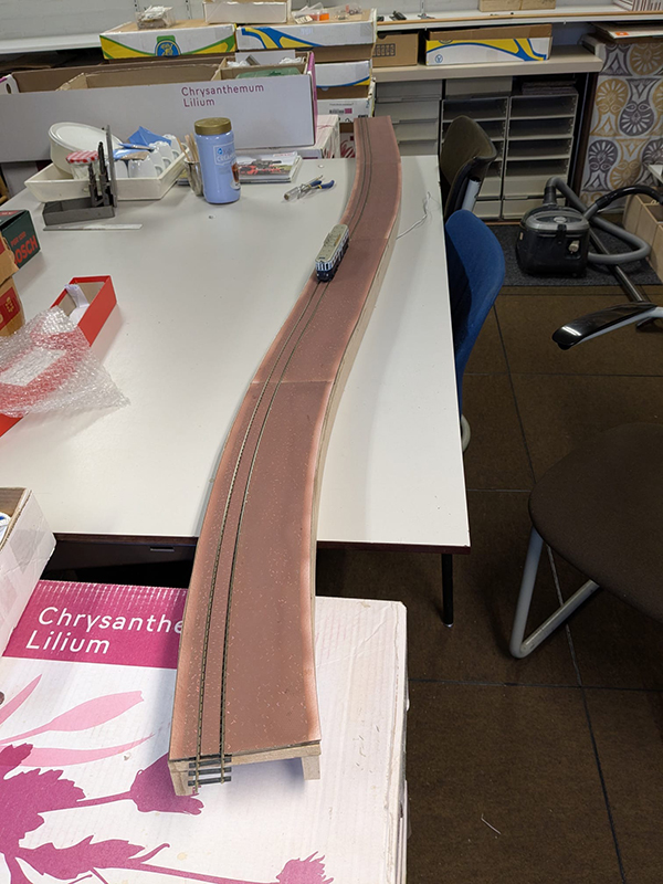 Omdat er steeds in de vitrine gewerkt wordt verschuift de rails iedere keer net genoeg zodat we storingen hebben. er Wordt nu een nieuw traject aangelegd op een houten ondergrond die stevig vastgeschroefd word op de houten ondergrond, De rails van messing nu naar nieuw zilver wordt aan de hand van van te voren gelaserde straatdelen tegen deze stukken aangelegd. De ondergrond wordt eerst zwart geschilderd en daarna wordt de rails tegen de straat gelegd. De opouw van de straat bestaat uit 3 lagen karton met verschillende diktes,