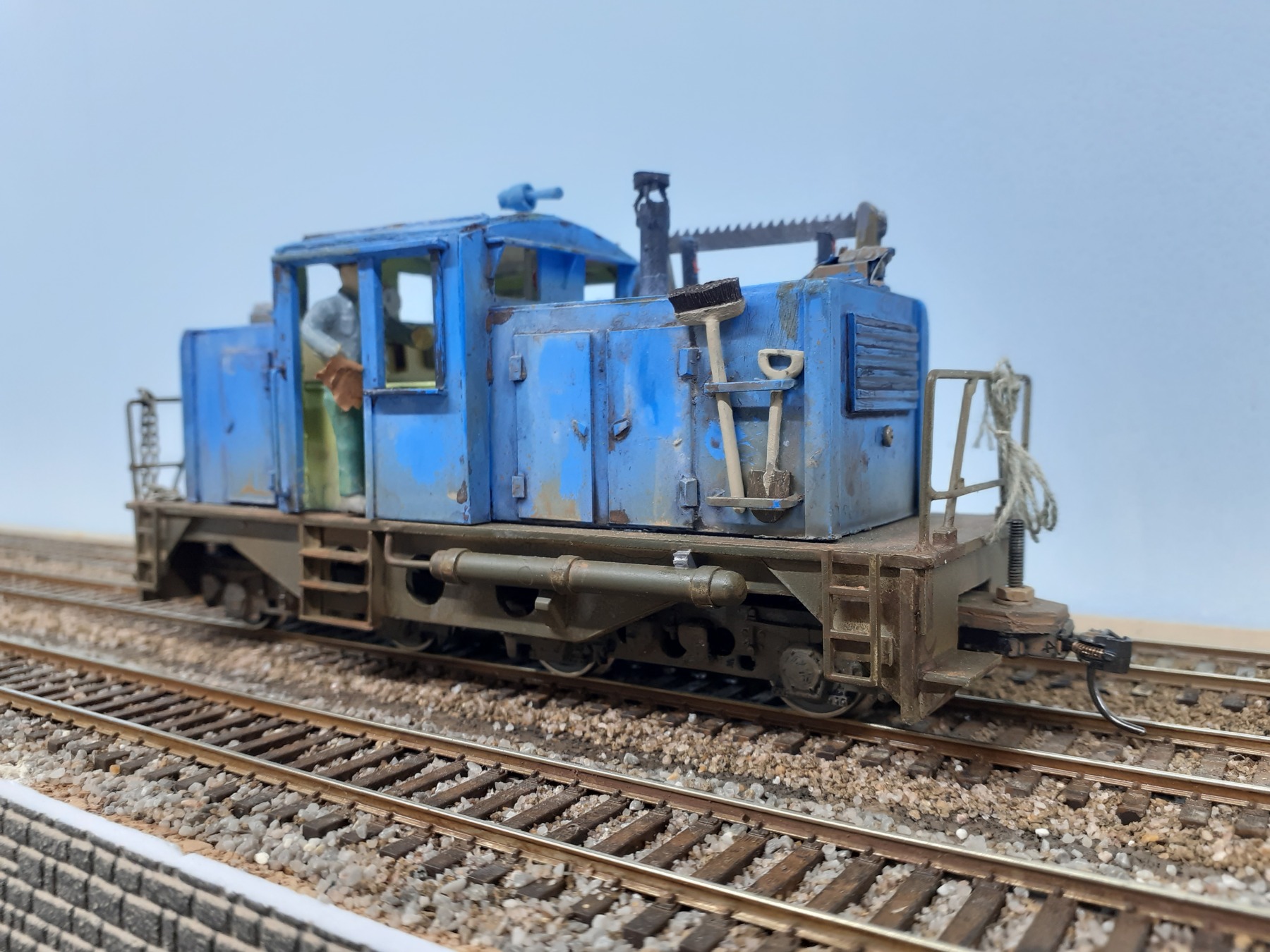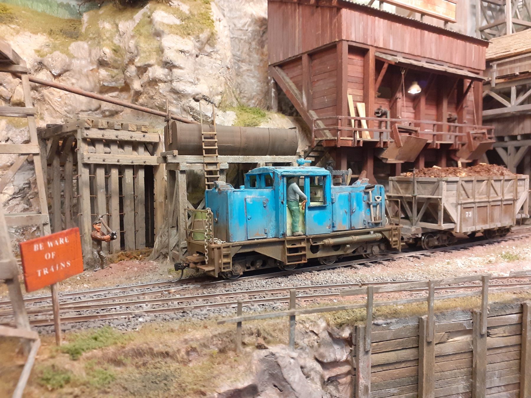 De loc is uit styreenplaat gebouwd op een gemotoriseerd onderstel van een eeuwen oude LIMA-H0 loc die bij ons op de club al jaren geleden in de vitrine geparkeerd was. Motorisch is er niets aan veranderd en dat betekent dat de rijeigenschappen uiterst matig zijn. Maar omdat hij op onze 0n30-baan slechts over een traject van 3 meter automatisch heen en weer pendelt tussen de kopermijn en de onzichtbare staging, kunnen wij daarmee leven. Hobbelend zoekt hij zijn weg over de baan waarbij hij één zelfgebouwde stortwagen voort duwt.