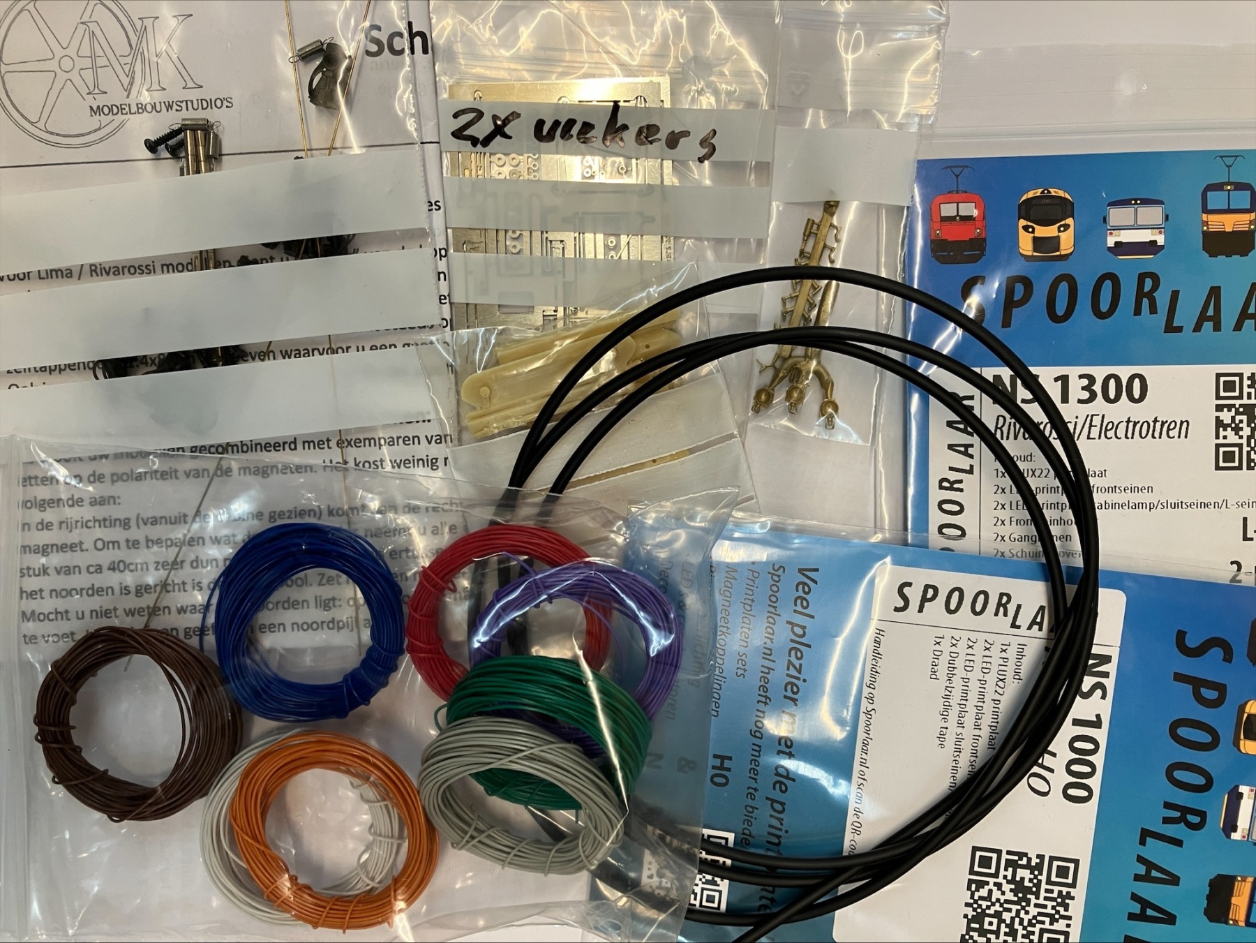 Bouwset 10 magnetisch koppelbare Scharffenberg koppelingen, 3 loklantaarns, setje ketelfrutsels, bouwset 2 Vickers pantografen, wat ombouw naar digitaal sets, rolletjes dun draad en krimpkous.