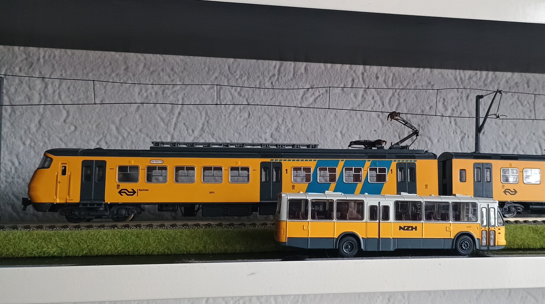 Vandaag een gezellige modelspoor reünie bij Bentink, toch ook even wat meegenomen, zoals een echte NZH bus voor bij de Sprinter. Jeugdsentiment+