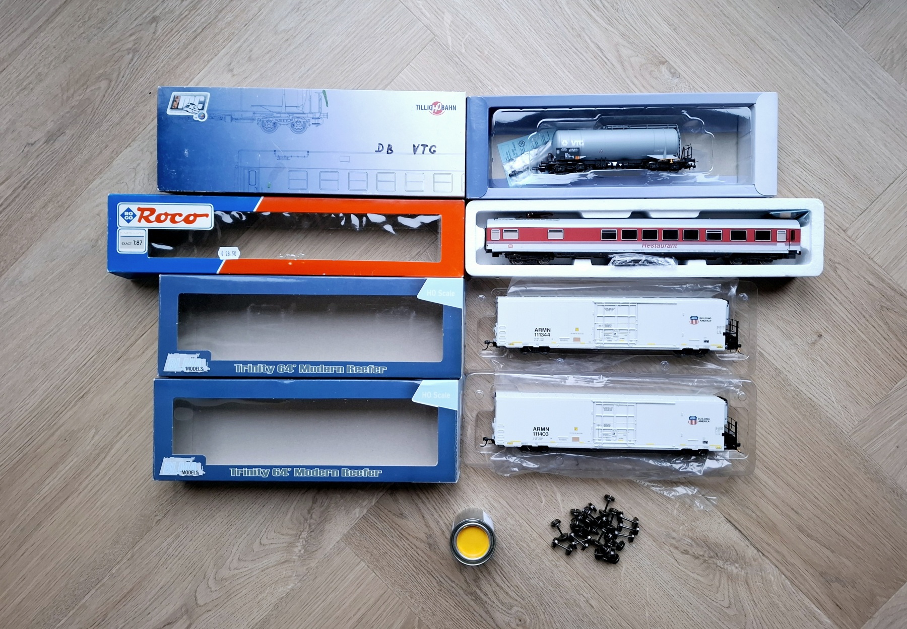 Twee Union Pacific koelwagens van BLMA, een mooie ketelwagen van Tillig en een gloednieuwe DB ARmz van Roco voor maar €25,-.