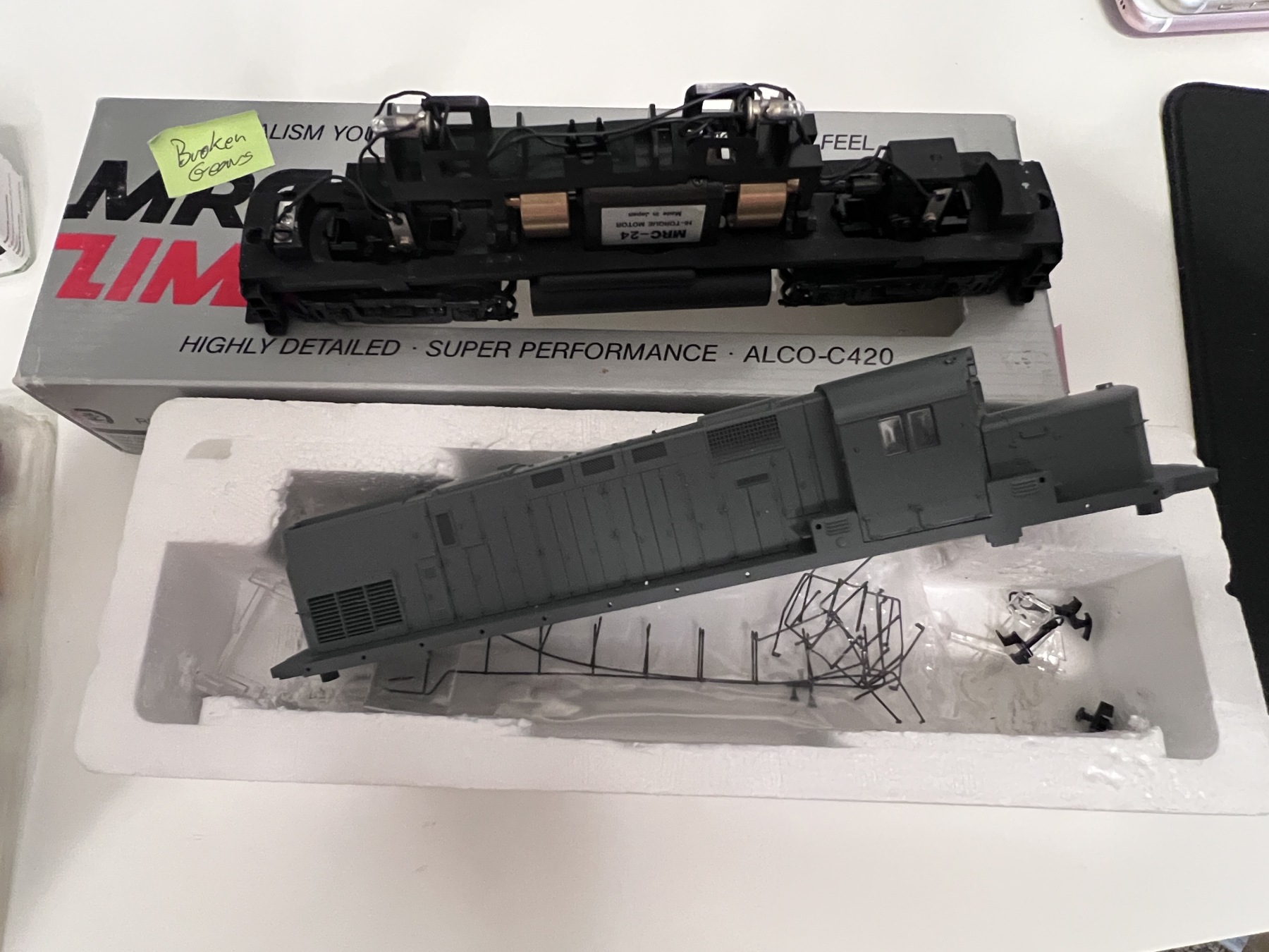 Gekregen, een curiositeit: een handgeknutselde 2400 met onderstel van messing en kap van hout. Signatuur doet mij (vanwege het hout) denken aan de bouwsels van Rob Mooij (huidig RH hoofdredacteur). Draaistellen zijn aangepaste 2200 draaistellen. Volgens mij zit er helemaal geen motor in, ding is te licht. Tegelijkertijd: waarom dan draaistellen met overbrenging gebruiken? Ik zal er wel nooit achter komen want het apparaat kan niet open zonder geweld te gebruiken en dat is dan gelijk einde verhaal. Deze komt denk ik in een loodsje achter een raam.