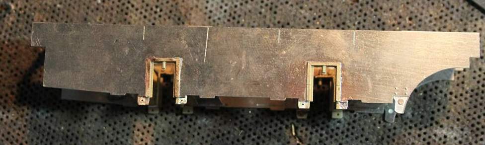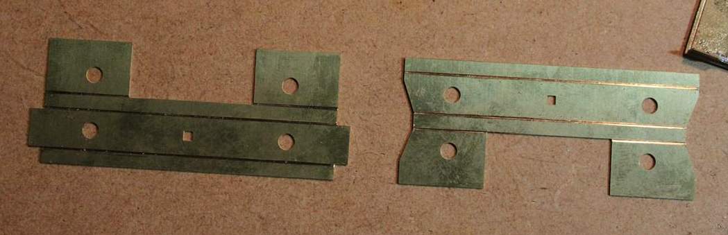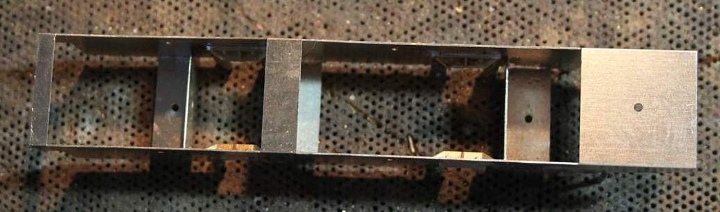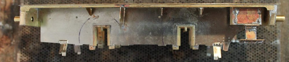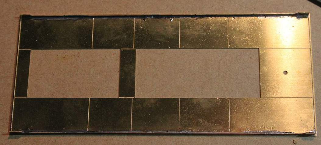 Dan kan een bufferbalk gesoldeerd worden. Moet wel pas gemaakt worden, zodat deze mooi tussen de stripjes past, en aansluit, daarna het frame, let op voor en achterkant, ook hier wat passen, eventueel van te voren de binnenkant bufferbalk iets breder maken. (tienden mm), daarna ook weer passen en meten, de andere bufferbalk erop solderen. Het frame valt dus in/tussen de bufferbalk, en past er dus niet meer tussen, als de bufferbalken al op de voetplaat zit!!