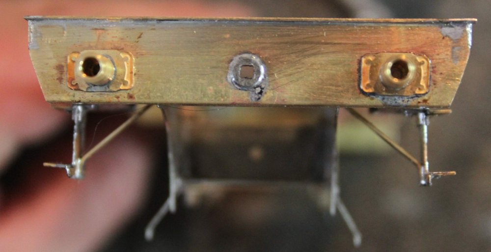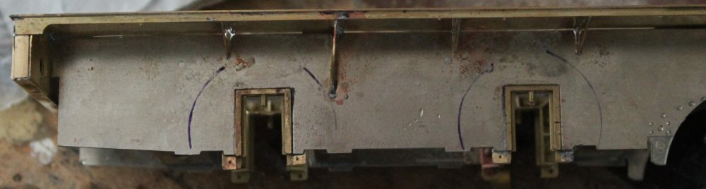Dan de bufferbalken, even de vouwnaden wat opruimen met een klein vijltje. Pas op, de lange bovenste naad is geen vouwnaad, maar even met een mes er langs, zodat je aan de buitenkant een lijn ziet lopen, meer niet. Verder afhankelijk van de versie, de klinknagels doordrukken met een klinknagelpersje. De 2 buitenste lipjer eraf halen, en met een vierkant volprofiel 2,5x2,5mm (voor de massieve houten bufferbalk opvullen. Voor de latere stalen versie, dus de klinknagels doordrukken, en bv. een U profiel gebruiken. Kijk goed naar foto's hoe het moet worden.