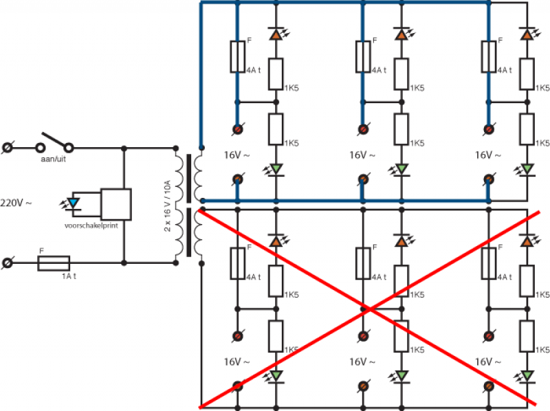 Heren bedankt voor de info.Dat is inderdaad wat ik wil, meerdere groepen maken.Op het plaatje van Bert is echter een trafo te zien met 2 secondaire uitgangen. Ik heb er maar eentje.Om een printplaatje te ontwerpen voor mijn trafo met 4 separate groepen heb ik te weinig kennis. Misschien kan ik het ook laten bouwen?