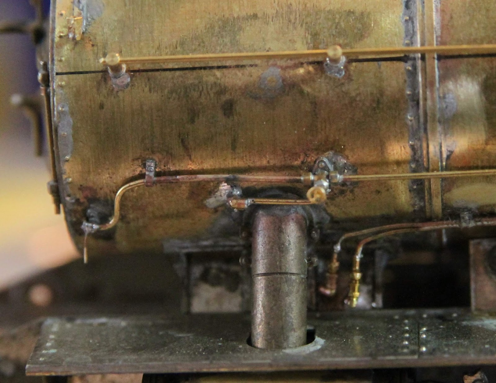 Volgende leiding. Van de stoomverdeler, onder circa 45 graden naar beneden over het ketelfront, kraan en dan naar de linker zijde.