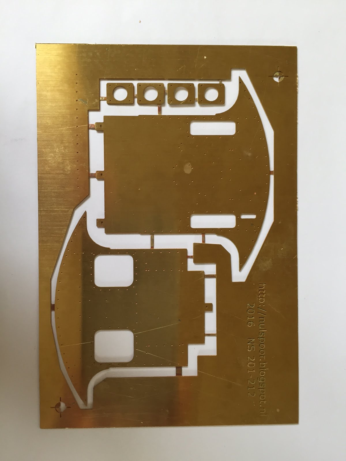 Eerste beelden van het etswerk. Na een ongelukkige posttraject met staking en nodeloos retourtje Nederland zonder huisnummer zijn de etsplaatjes binnen. Deze keer in verschillende diktes, dat is bij Moog niet duurder, dus waarom niet. Messing 0,4mm voor de opbouw, 0,6mm voor het frame en 0,9 voor de treeplanken. Ook nog wat details in 0,25 nieuwzilver