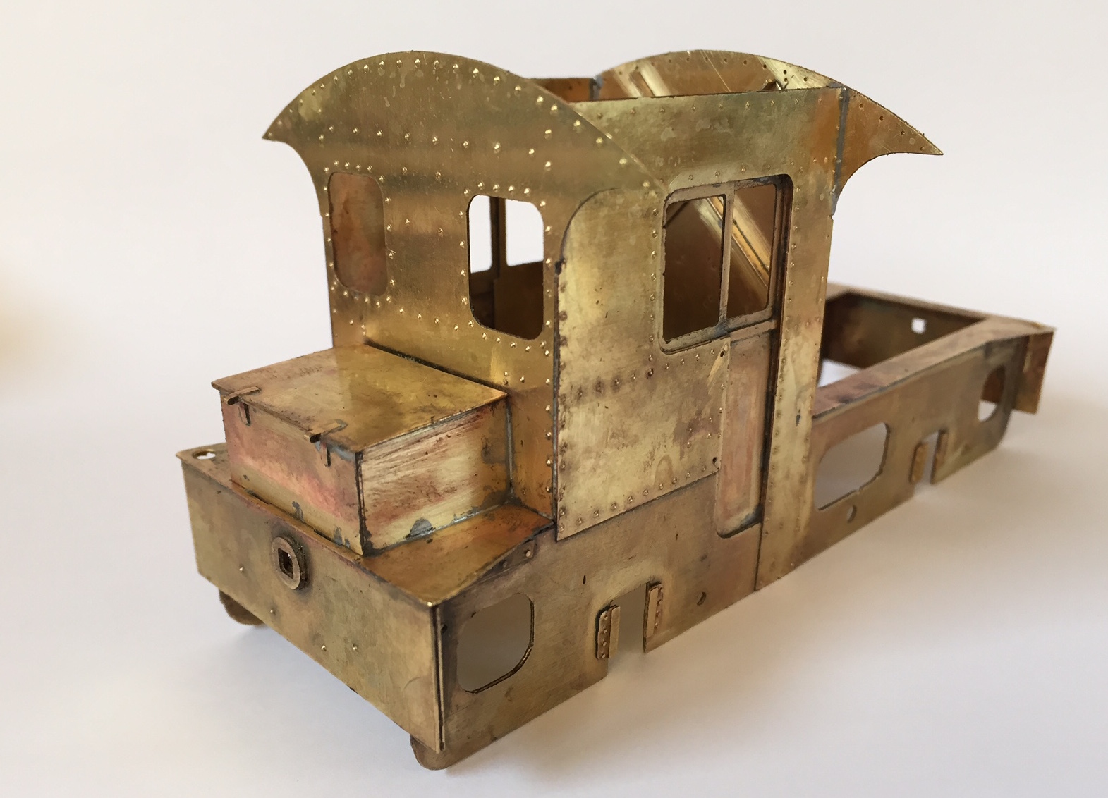 De wanden van het machinistenhuis lopen over de frameplaten en onderbreken de voetplaat. Dus maatvoering van die onderdelen is wel een issue. Ik heb daar het volgende op bedacht: de twee voetplaatgedeeltes zittesvop de juiste afstand in de etsdeeltje, dus eerst frameplaten solderen en dan pas uit de fret knippen. Gelijk een prima haaks en recht begin. Volgende stap is natuurlijk een paar avondjes vijlen en klinknagels persen. Hoewel de eerste serie sikken veel verzonken klinknagels heeft blijven er nog genoeg over