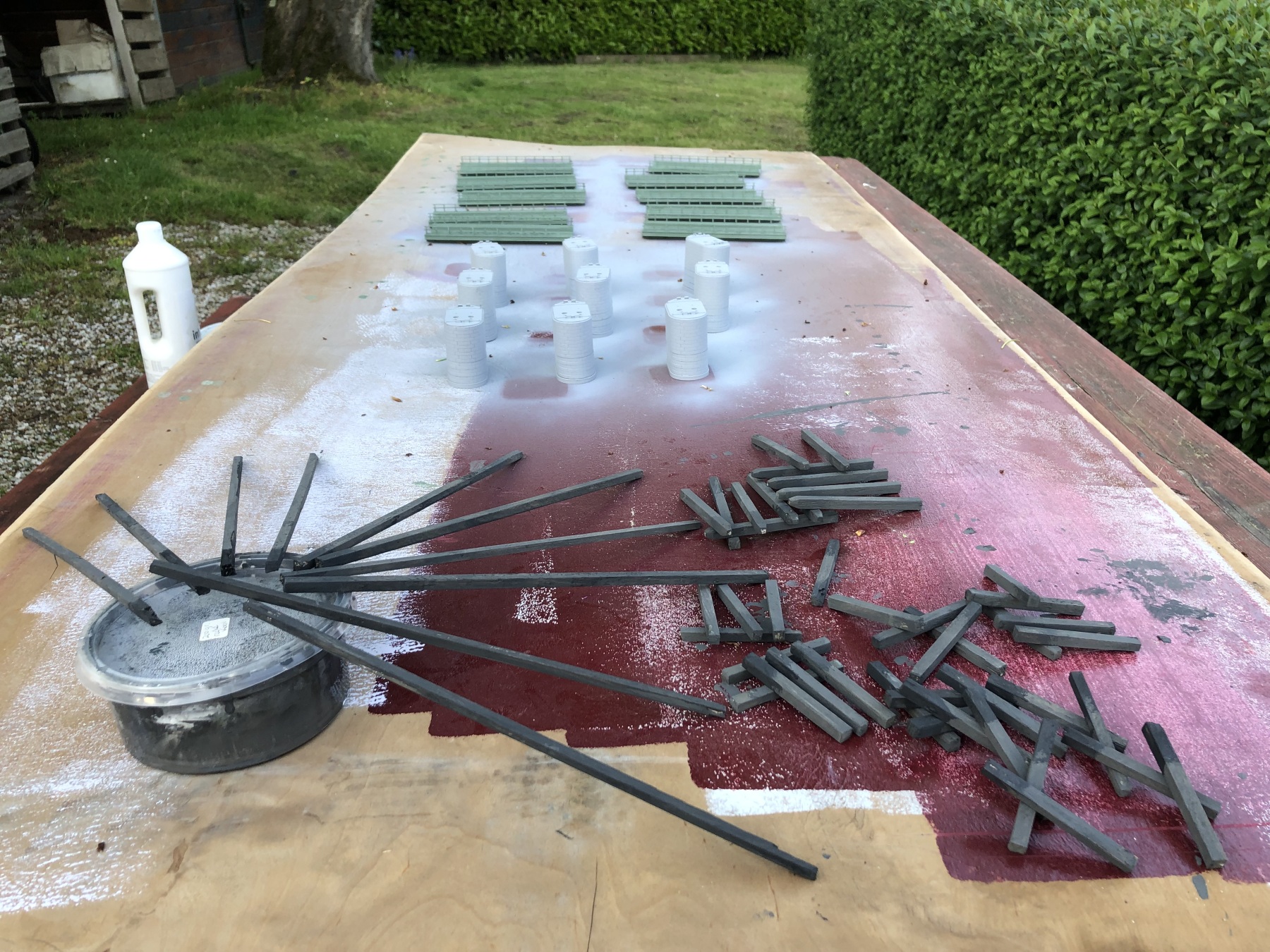 De palen zijn inmiddels op kleur. Die kunnen worden vastgelijmd. En dan kan het hele spul verder worden bijgekleurd en van een beetje groen voorzien.