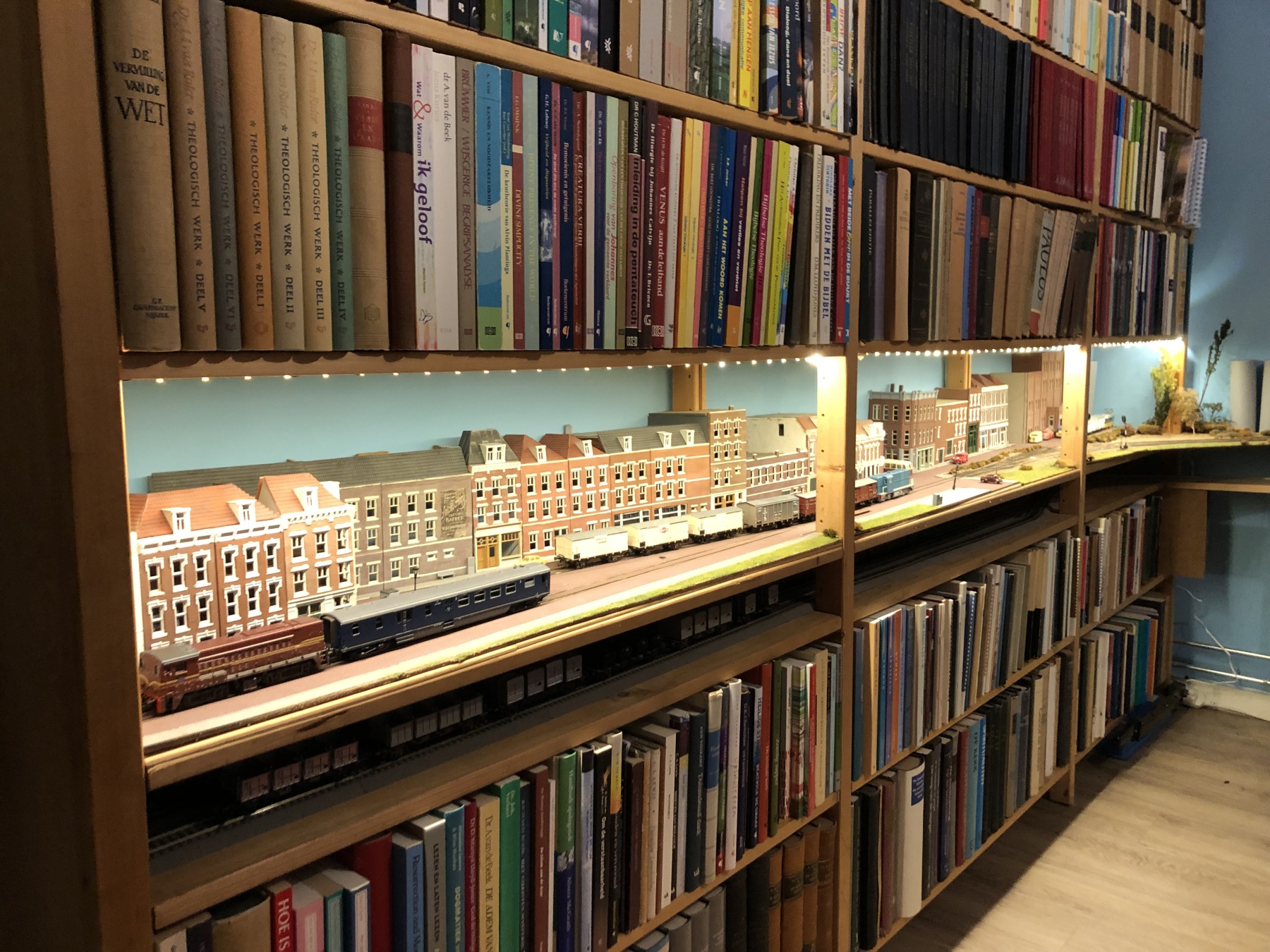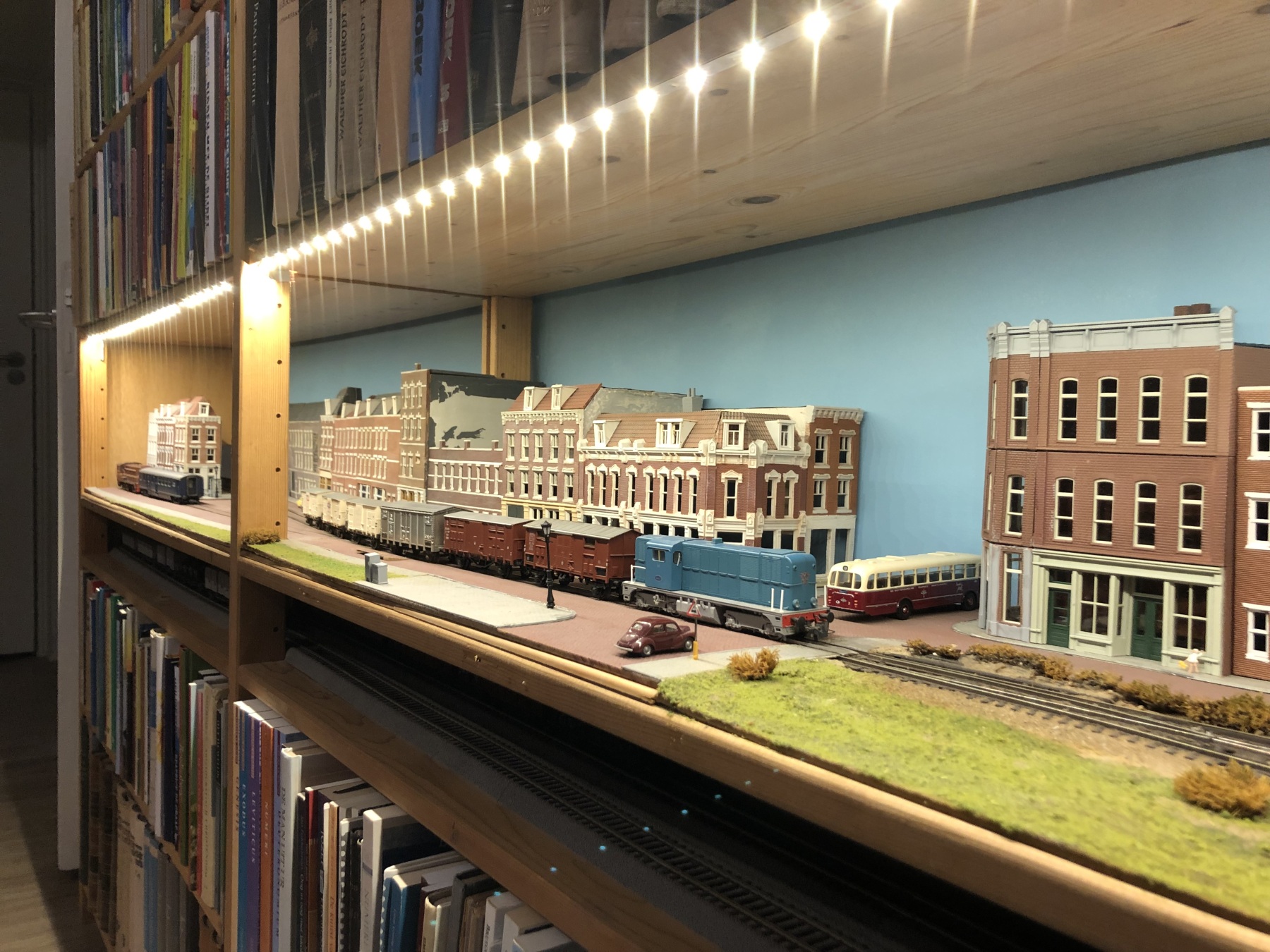 Een bijzonder fijne aanwinst: een LED-strip boven het baangedeelte in de boekenkast.