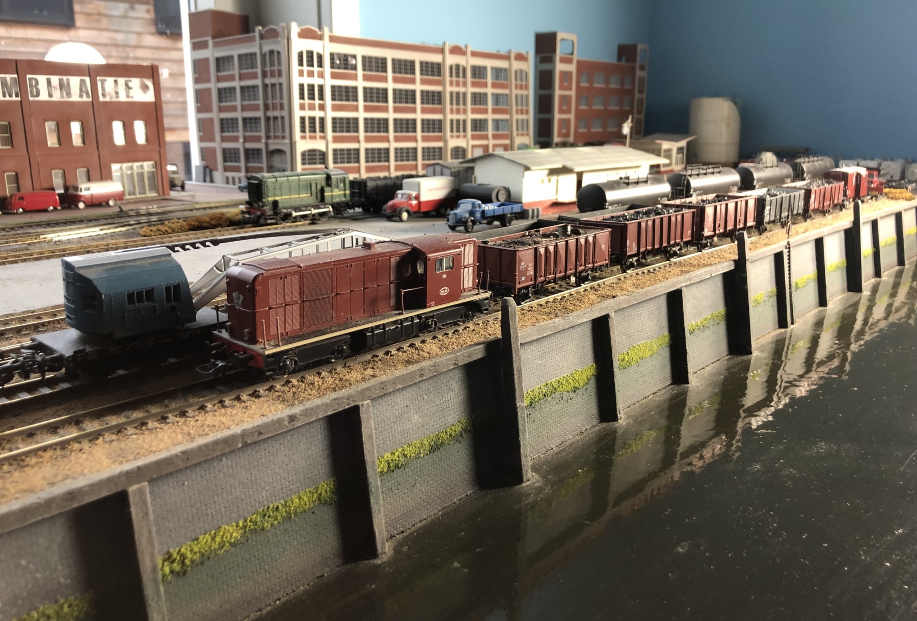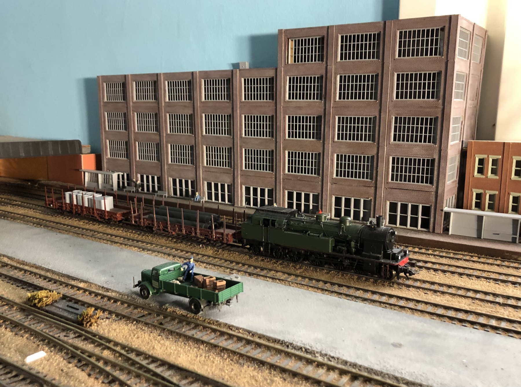 Die goederenloods heb ik gebouwd en al op een beurs gevonden. Er zat een grond plaat onder die ik heb verwijderd. Het is een vrij eenvoudig model, maar het heeft een mooi dak en is precies geschikt voor deze plek. Ik heb ernaar gezocht maar heb nog niet kunnen achterhalen welk merk het is.