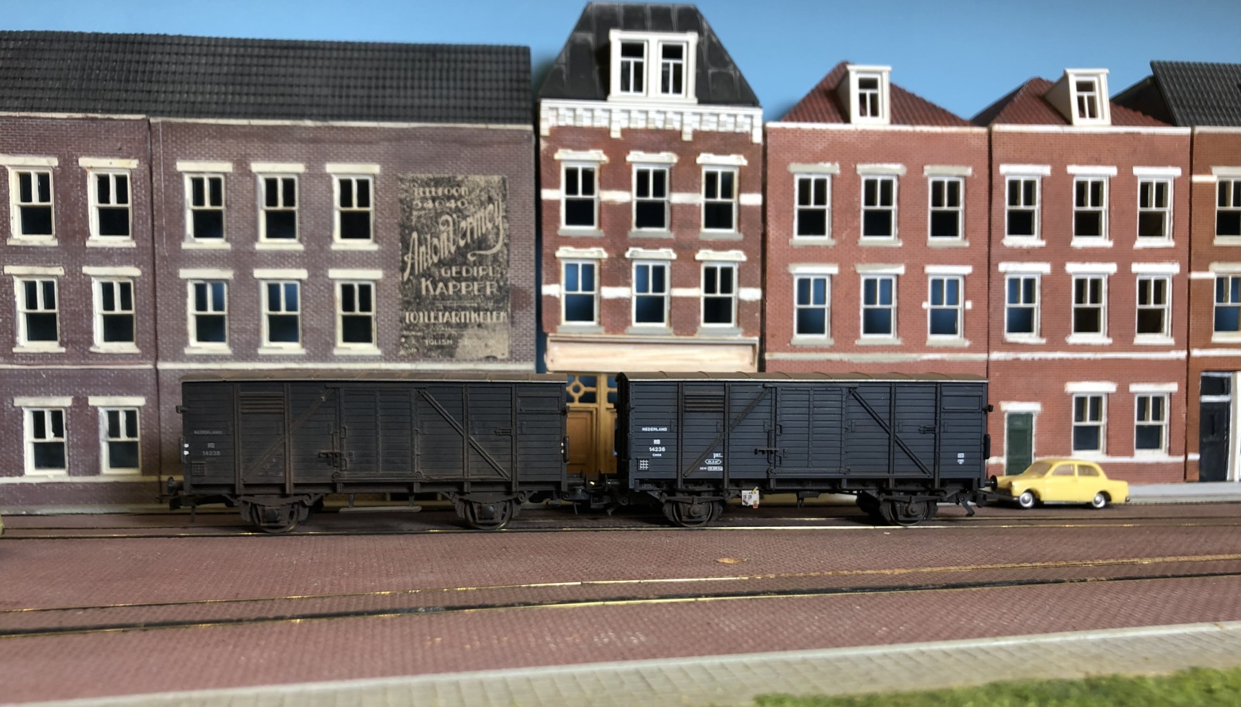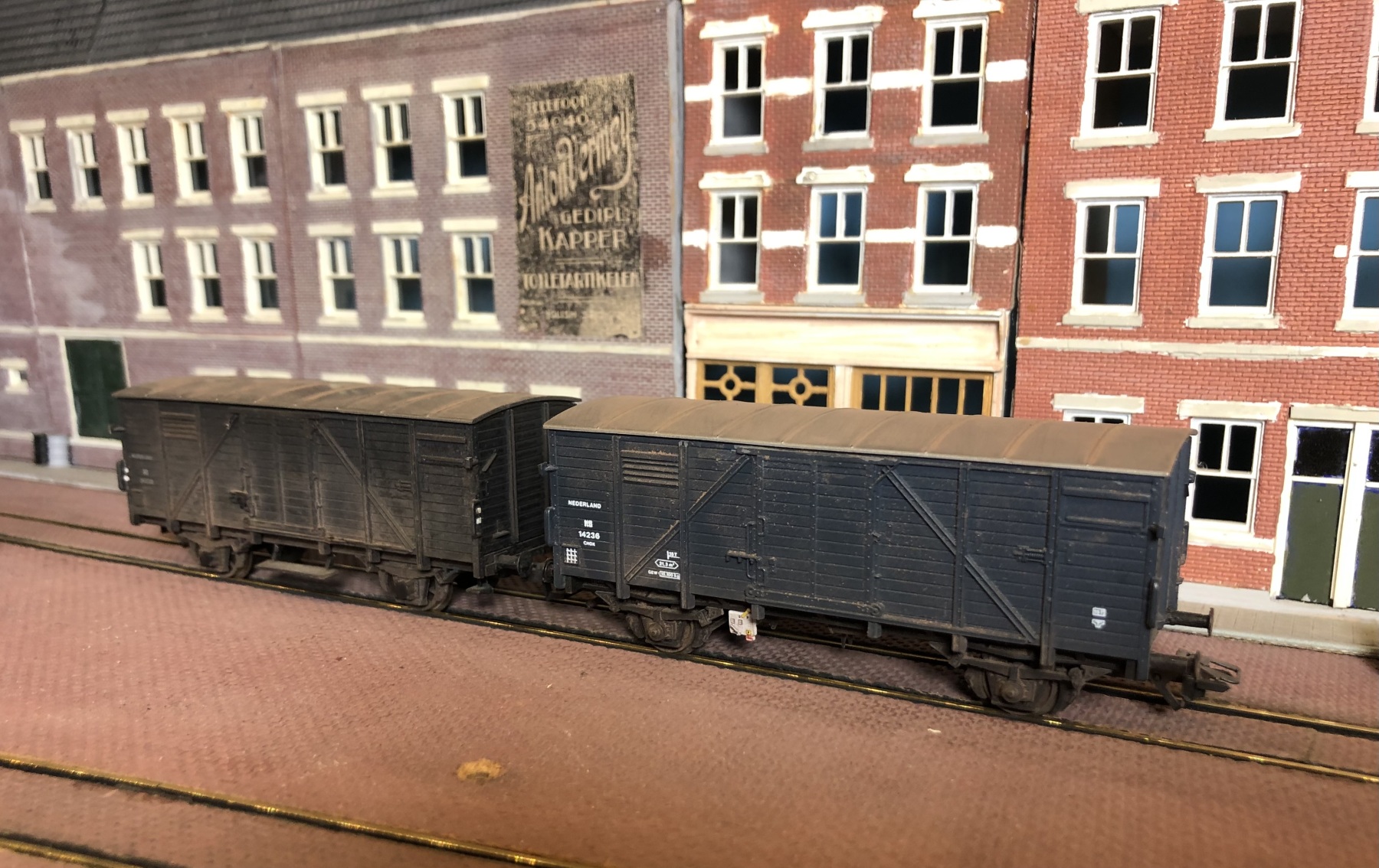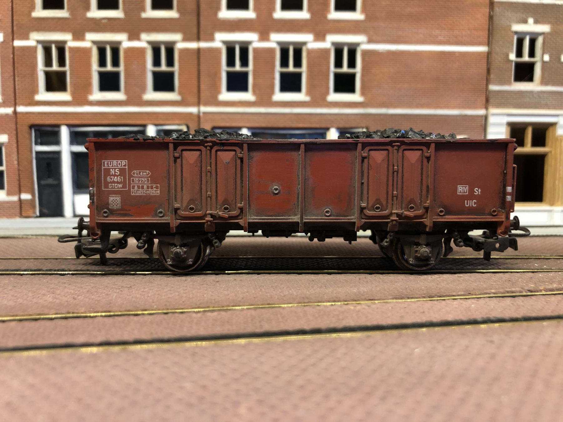 Zes van die G10 wagens, bij NS CHOK, met een afwijkend dak. Hoe kloppend dat is, verneem ik graag van de kenners! Vooralsnog met de nodige kleurverschillen. De glimmende daken worden in ieder geval nog overschilderd.