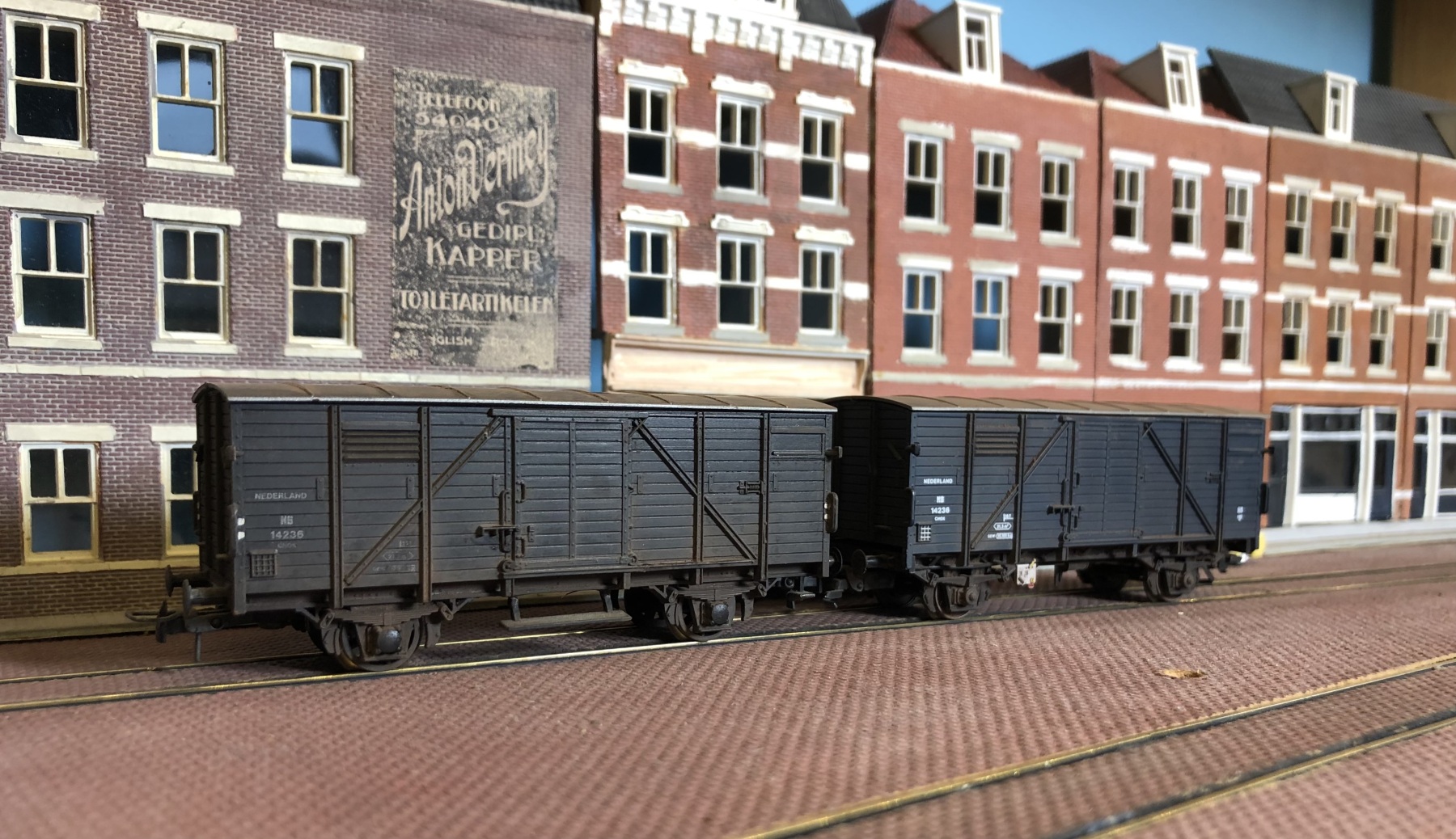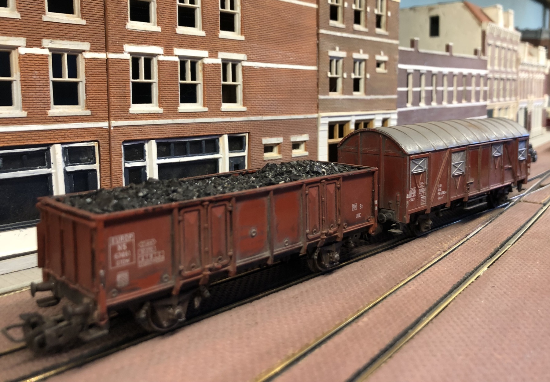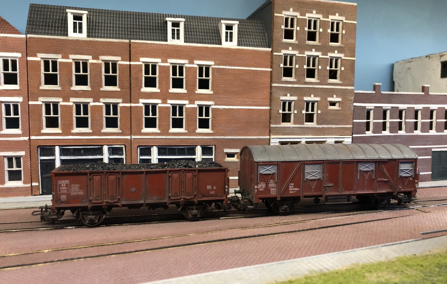 Zes van die G10 wagens, bij NS CHOK, met een afwijkend dak. Hoe kloppend dat is, verneem ik graag van de kenners! Vooralsnog met de nodige kleurverschillen. De glimmende daken worden in ieder geval nog overschilderd.