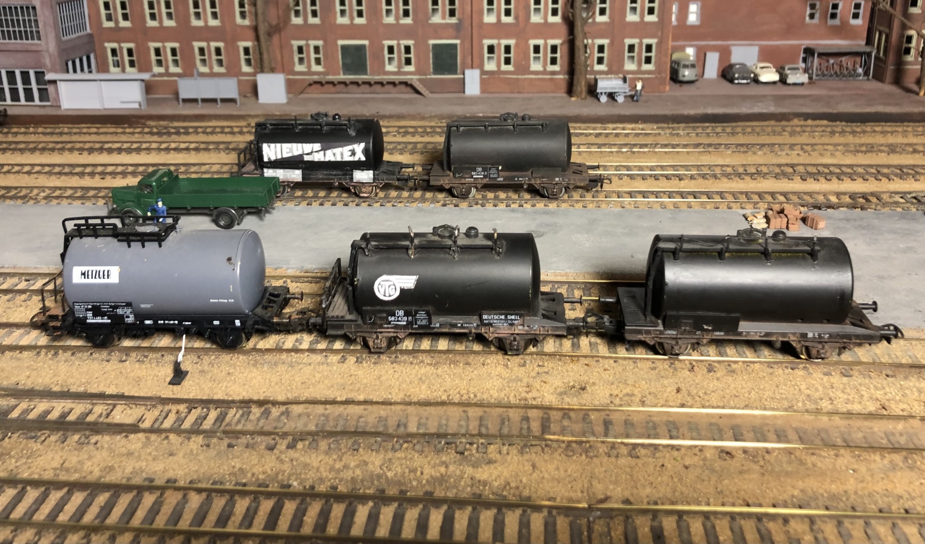 Naast de Marklinwagen - met capaciteit van 360 hl (staat op het frame) - ook nog vier Uerdinger ketelwagens van Piko. Die hebben zo te zien een wat kleinere tankinhoud. Ik heb het wel eens nagemeten en kwam op ca 300 hl (30 kuub).