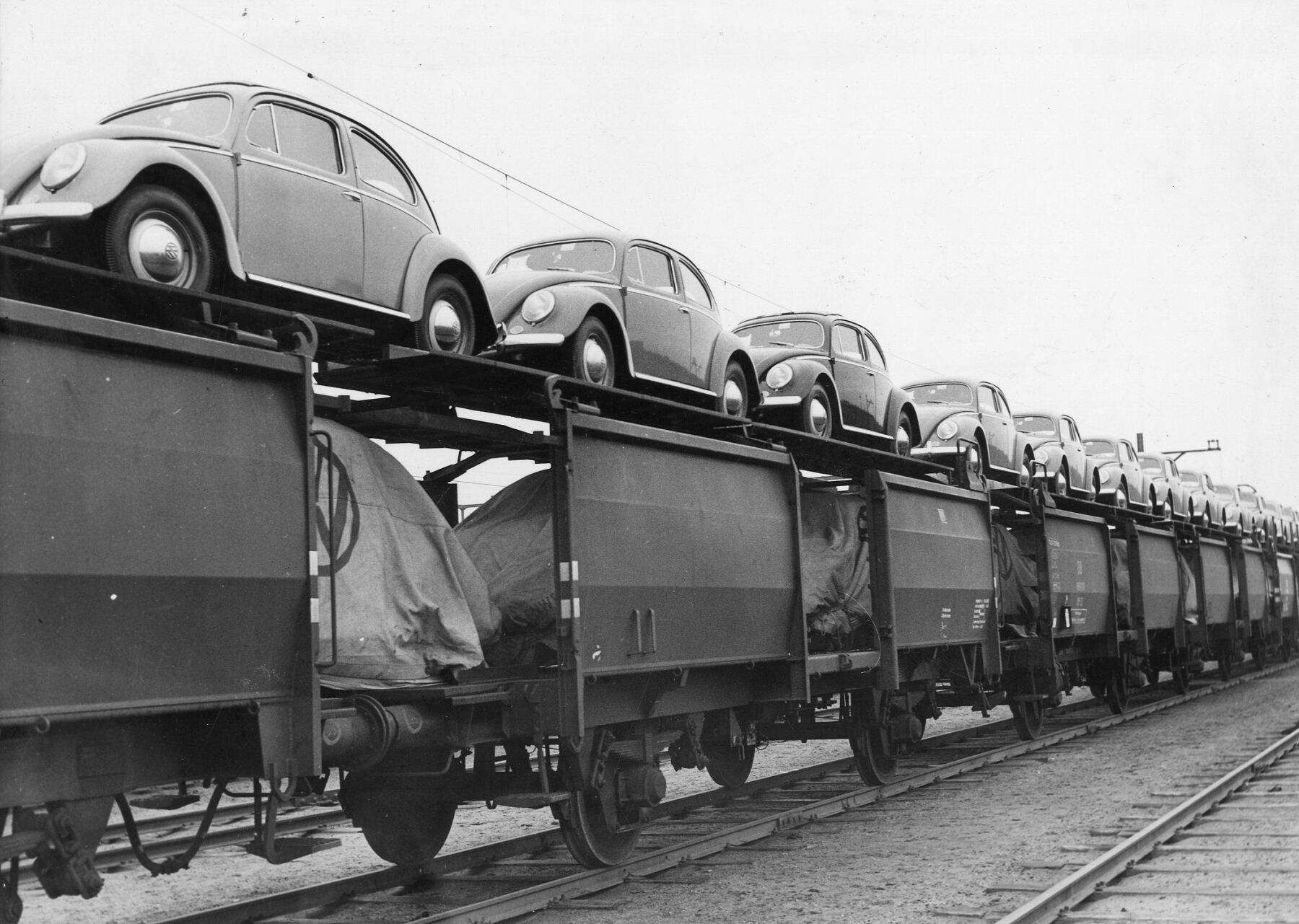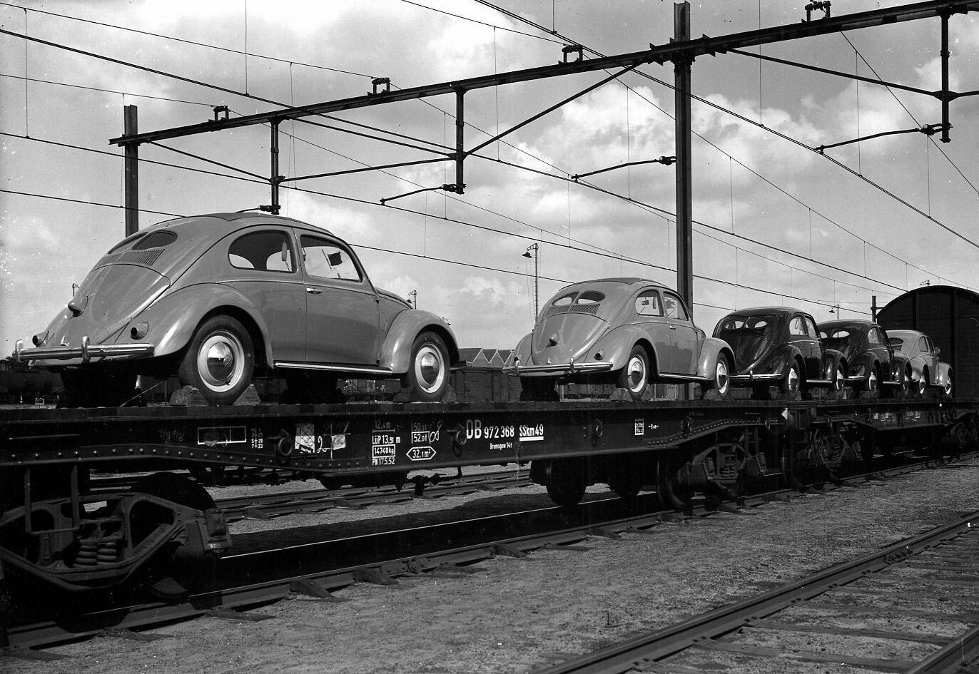 VW-kevers op DB-autotransportwagens type Off 52, Amersfoort 03-04-1954 HUA