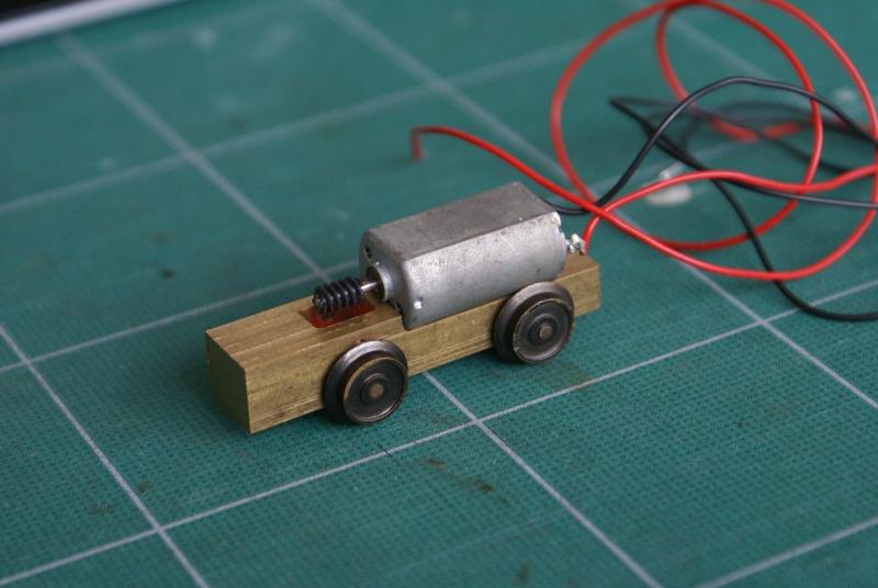 Daarom bovenstaande eigenbouw met correcte as afstand (28 mm), gefreesd uit een staaf messing met tandwielen van Weinert en een CD-la motor van Matsushita.