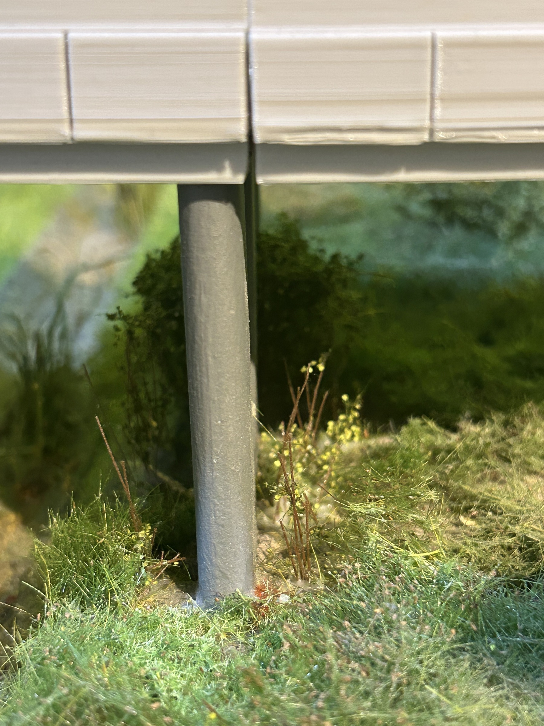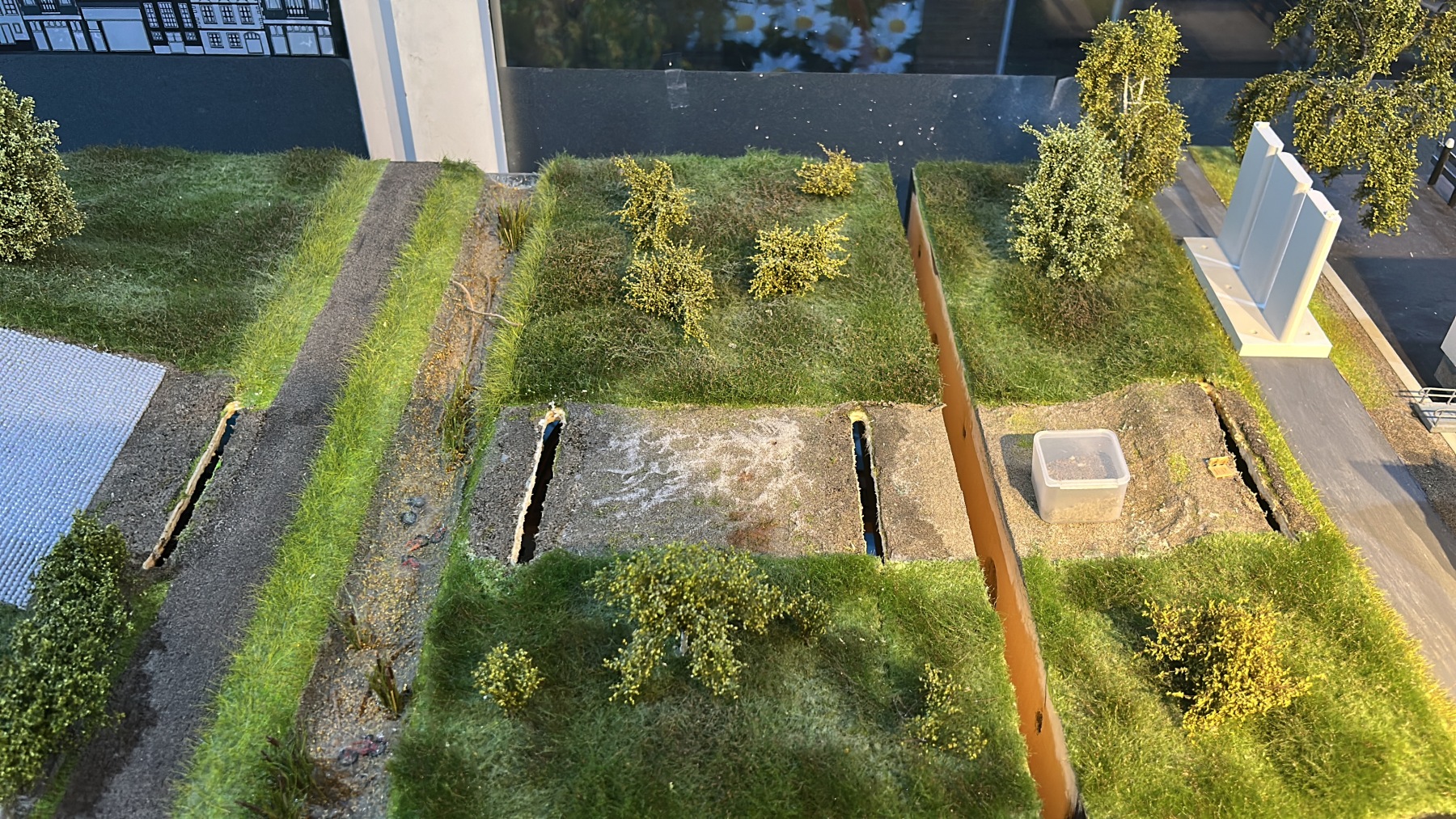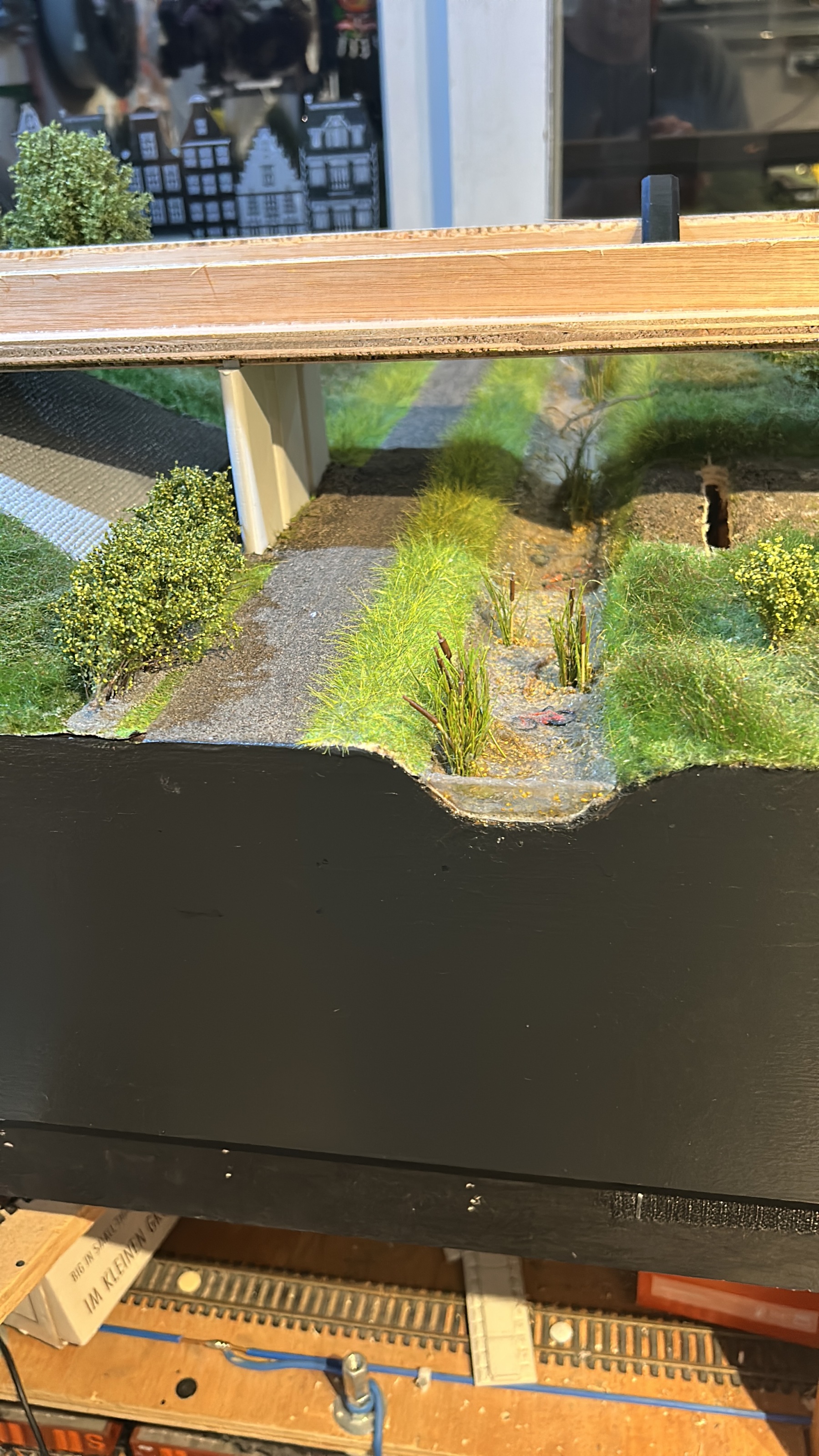 Boven zie ik nog een tweetal masten van een bovenleidingsportaal en onder is een heg te zien.