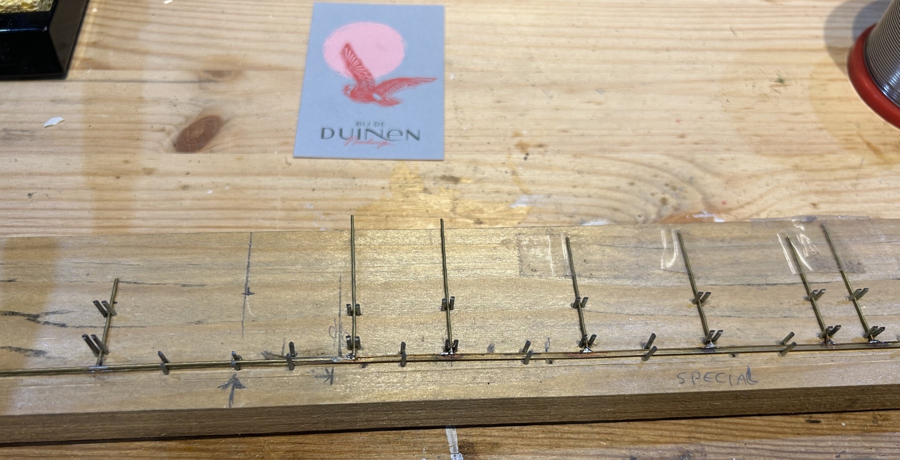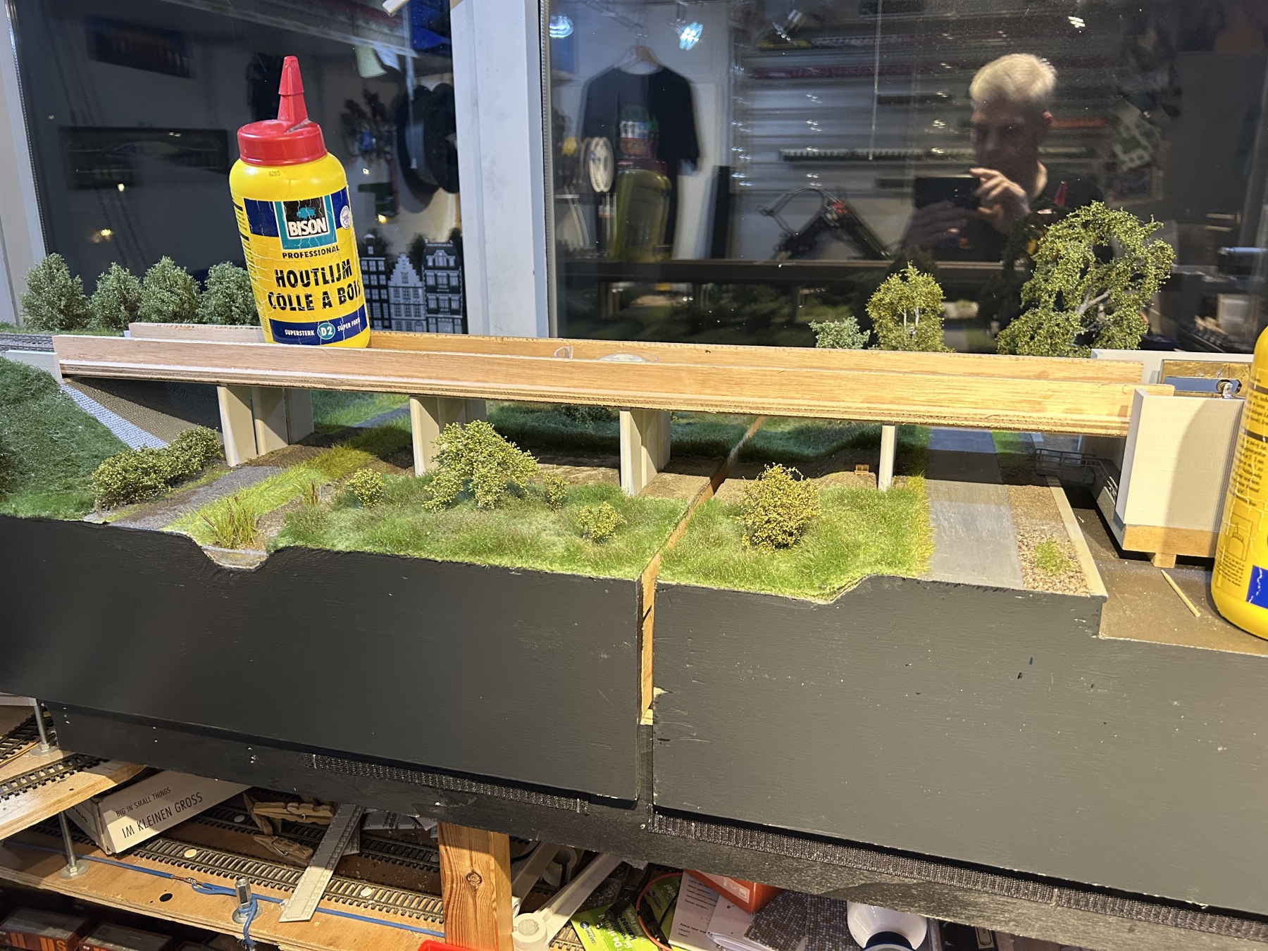 Boven zie ik nog een tweetal masten van een bovenleidingsportaal en onder is een heg te zien.