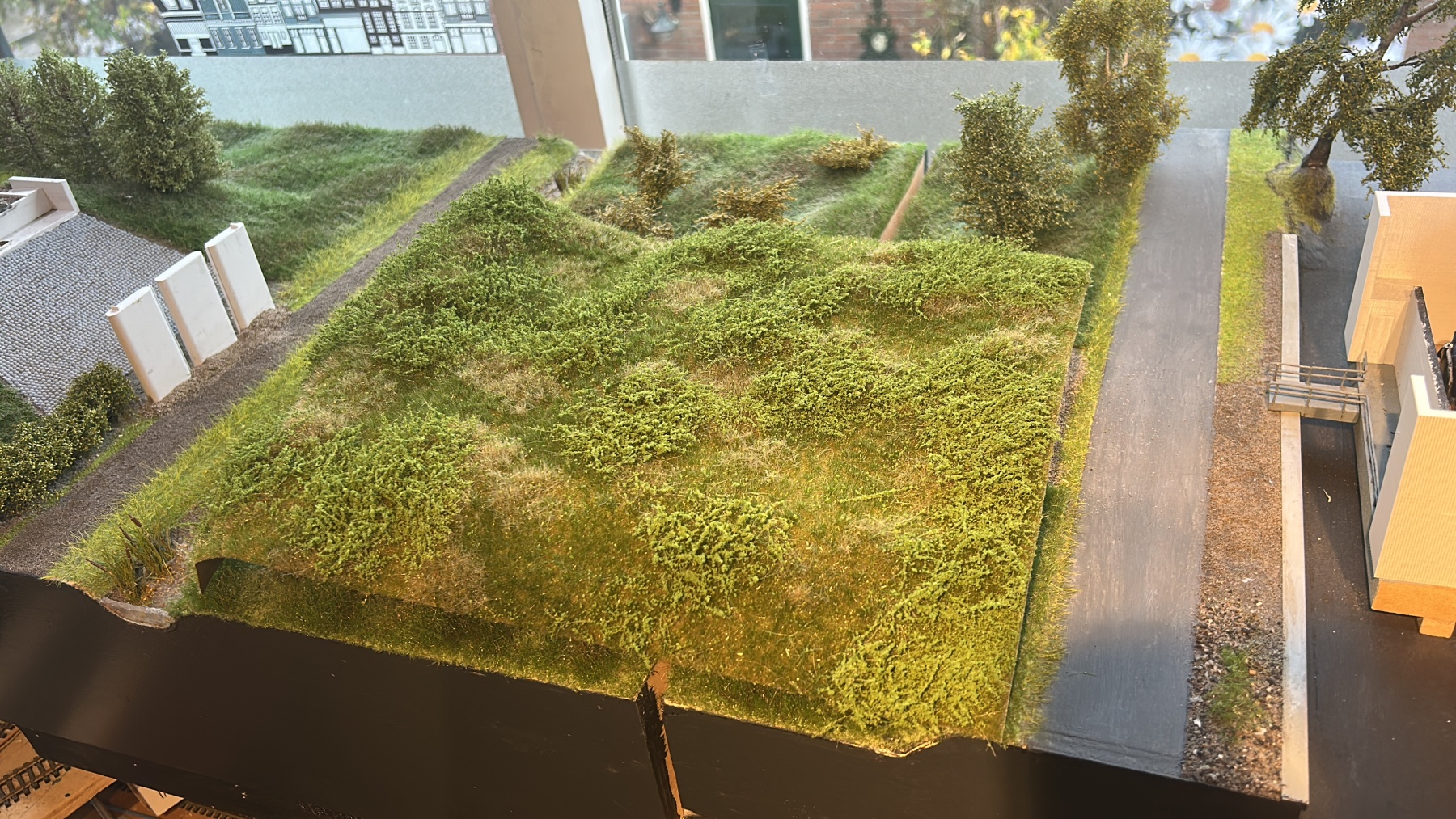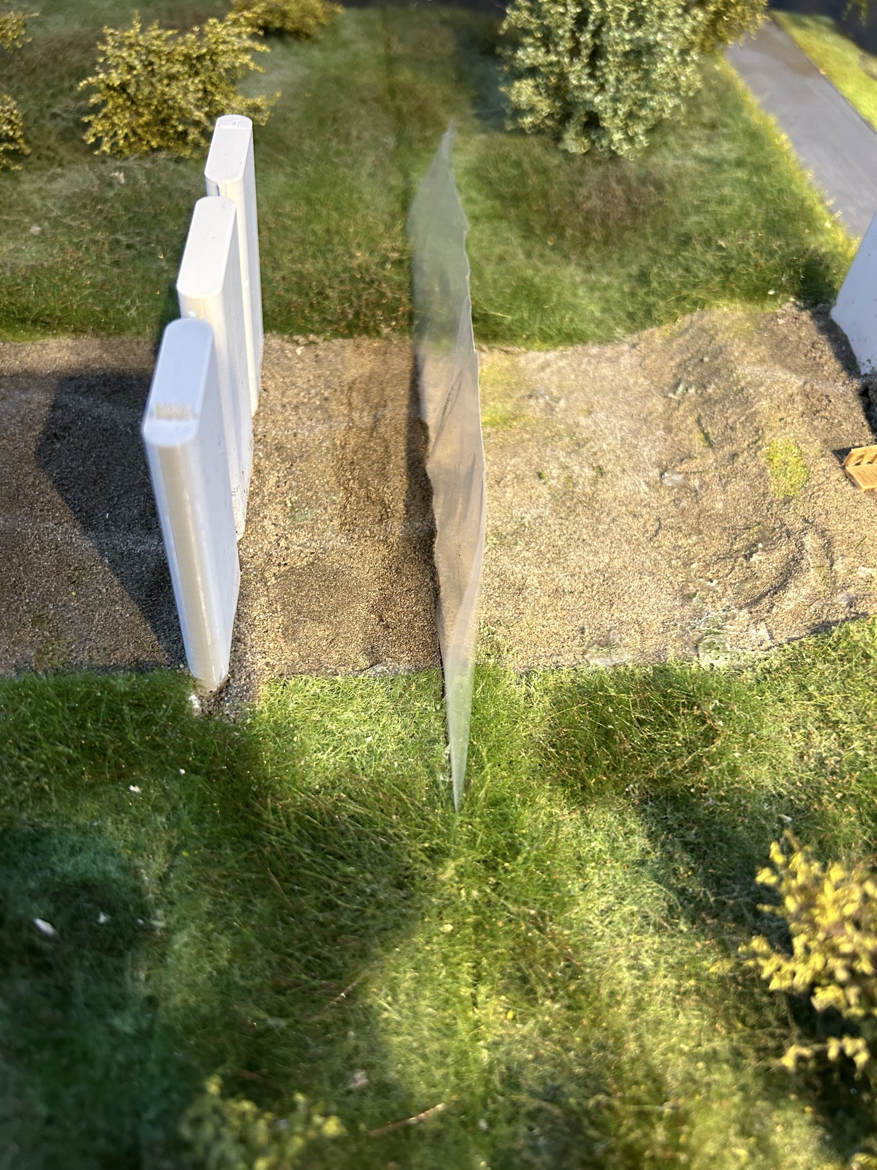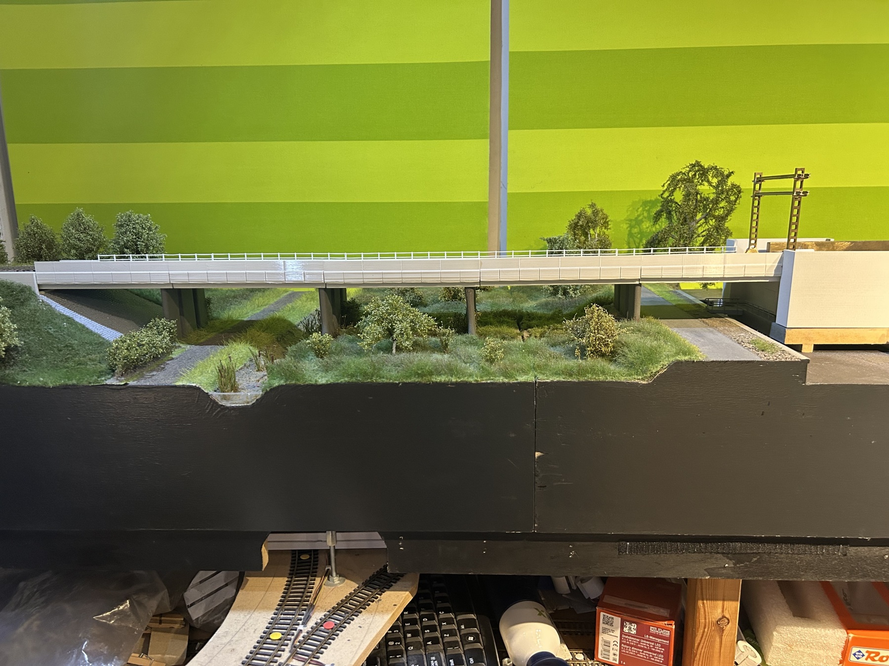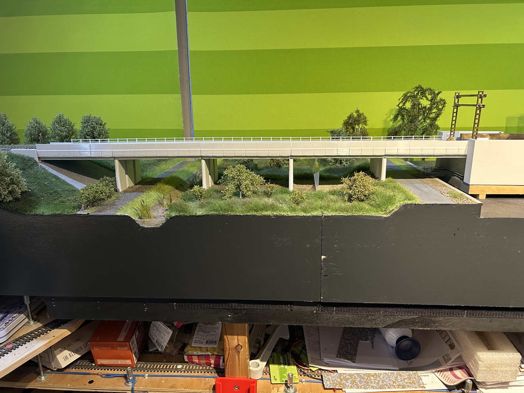 Boven zie ik nog een tweetal masten van een bovenleidingsportaal en onder is een heg te zien.