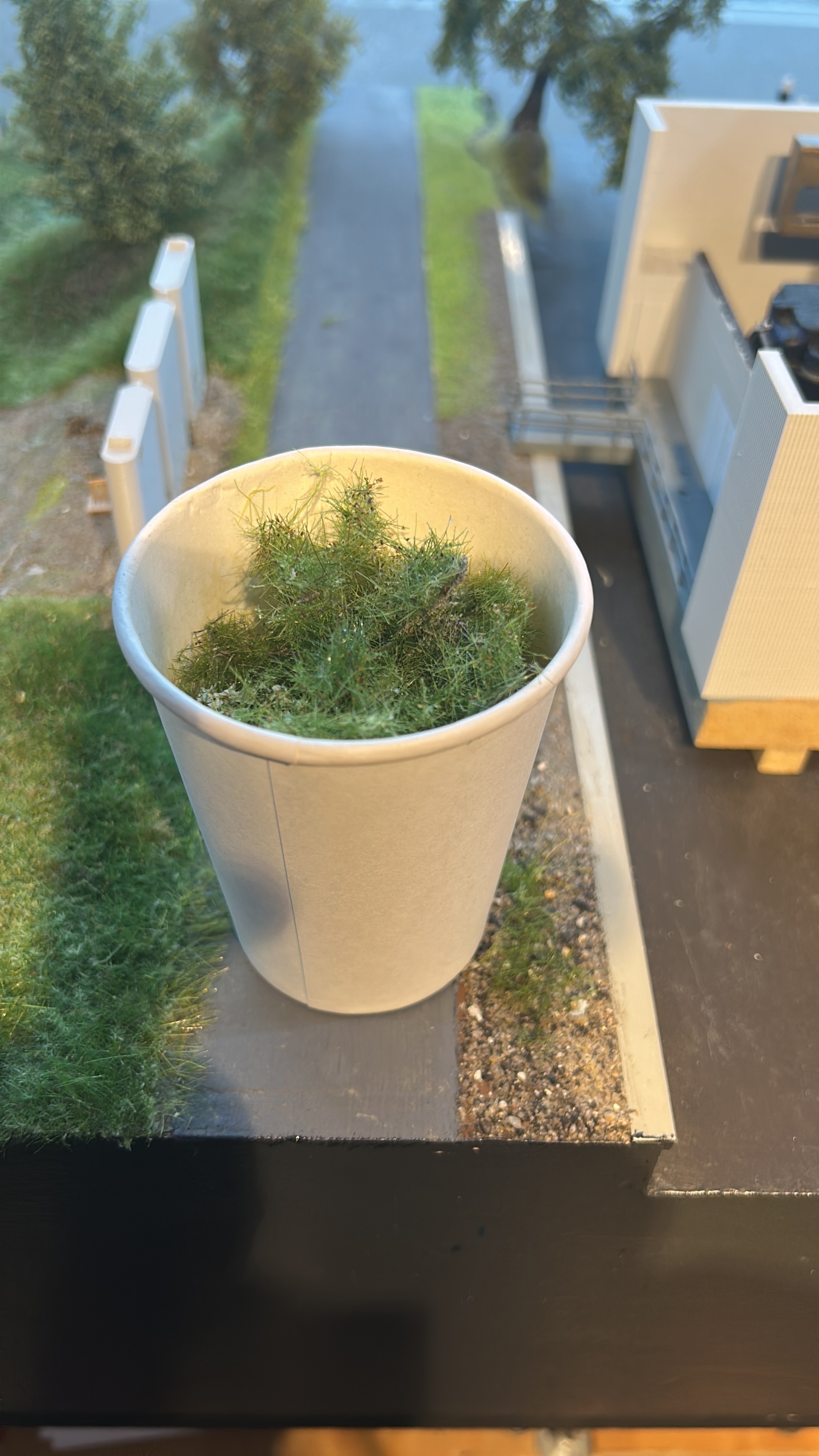 Boven zie ik nog een tweetal masten van een bovenleidingsportaal en onder is een heg te zien.