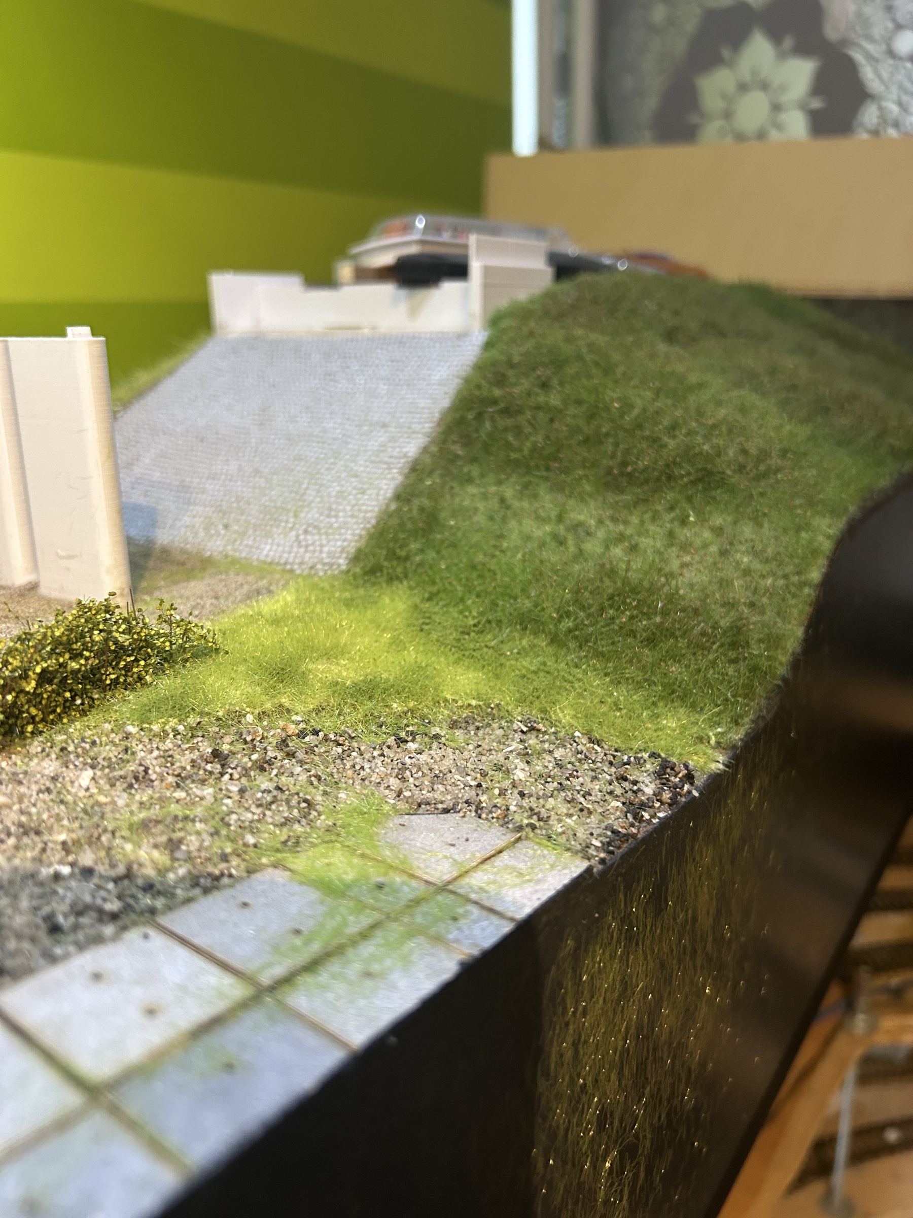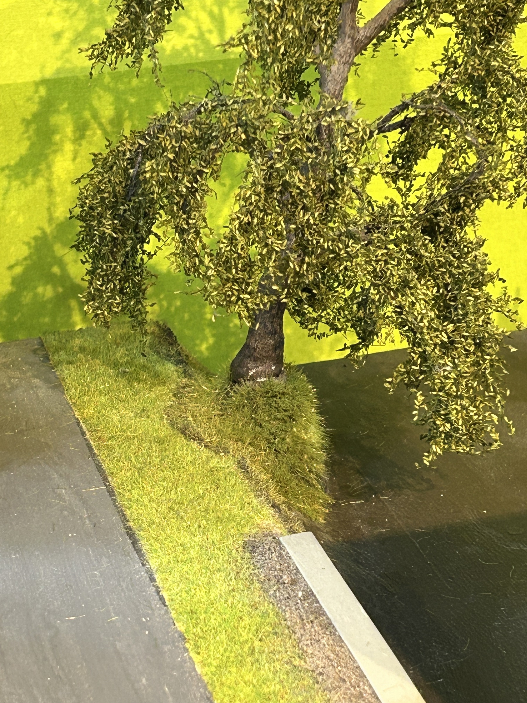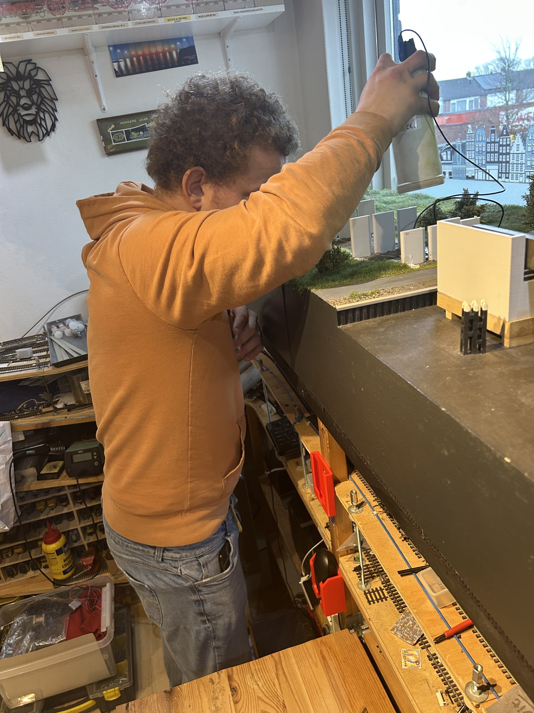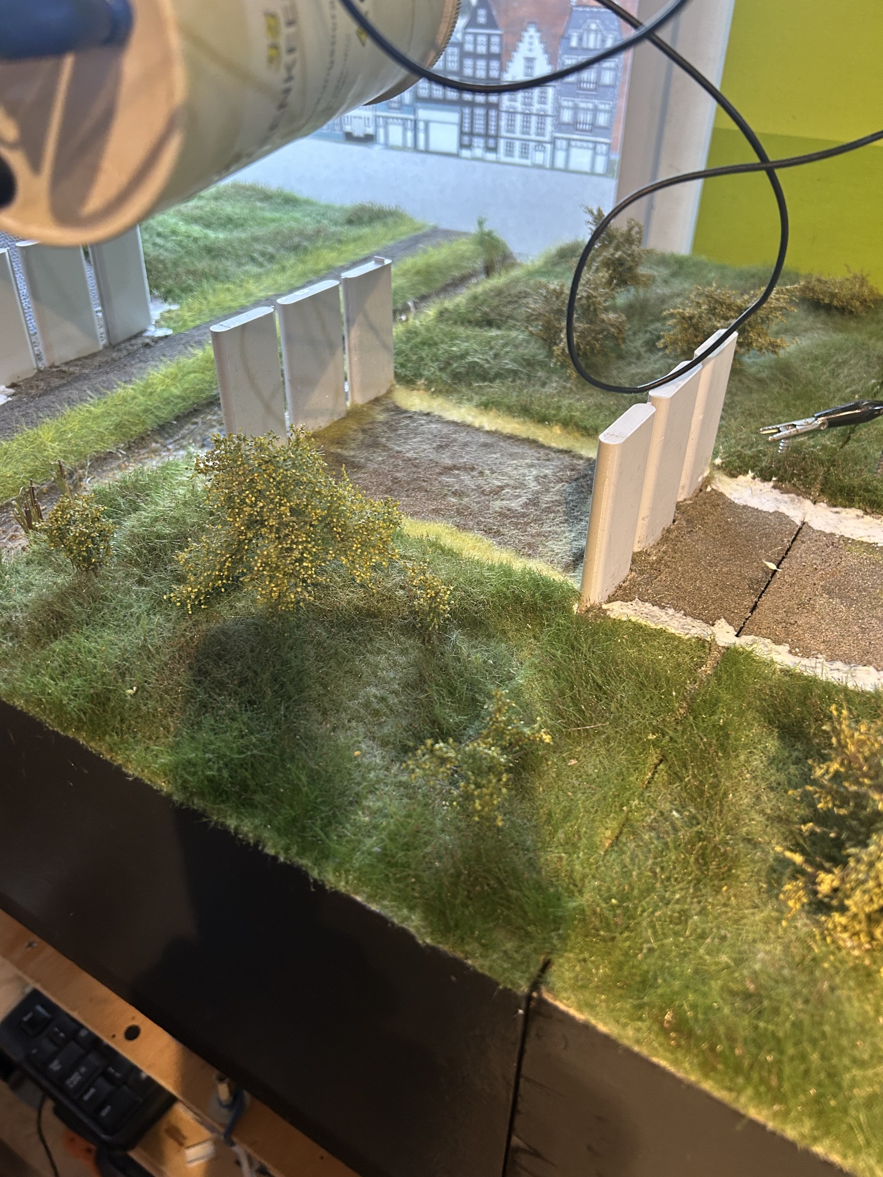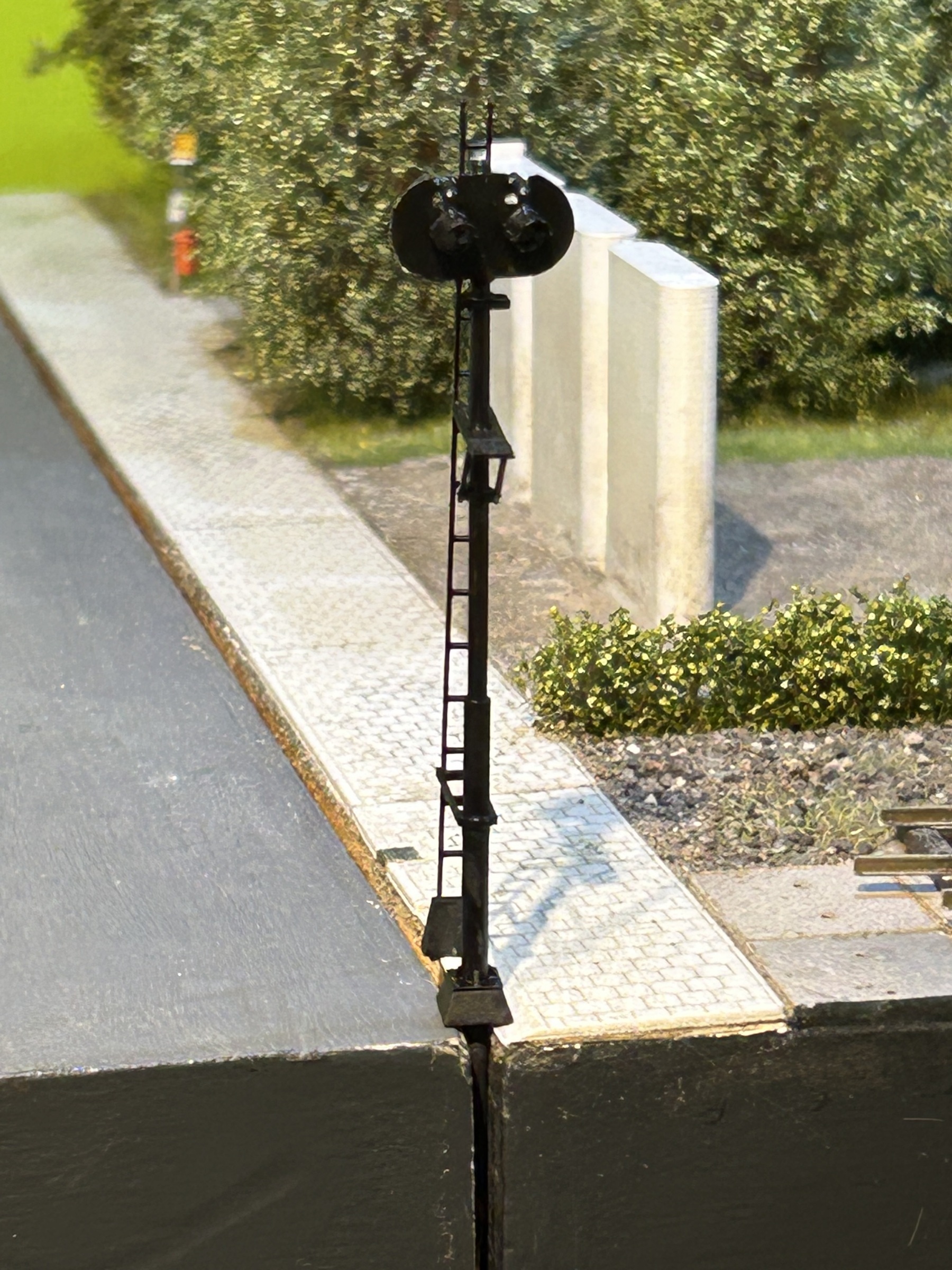 Boven zie ik nog een tweetal masten van een bovenleidingsportaal en onder is een heg te zien.