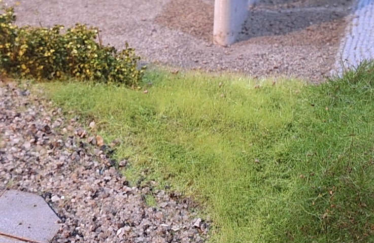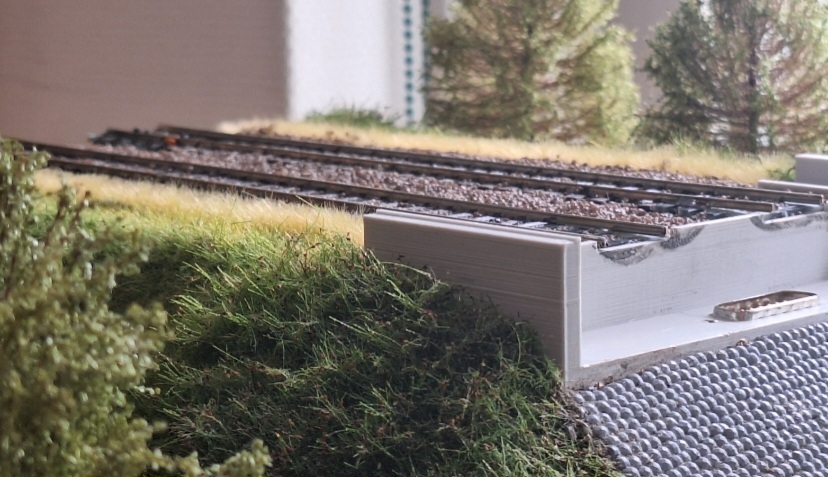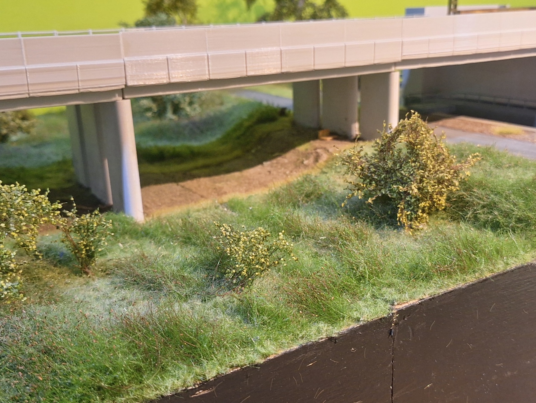 We hebben de randen langs het spoor voorzien van dood wild gras (4mm) en ook de randen langs de brug van het overige groen. Om het dode gras wat te doorbreken gebruik ik turf van woodland scenics.