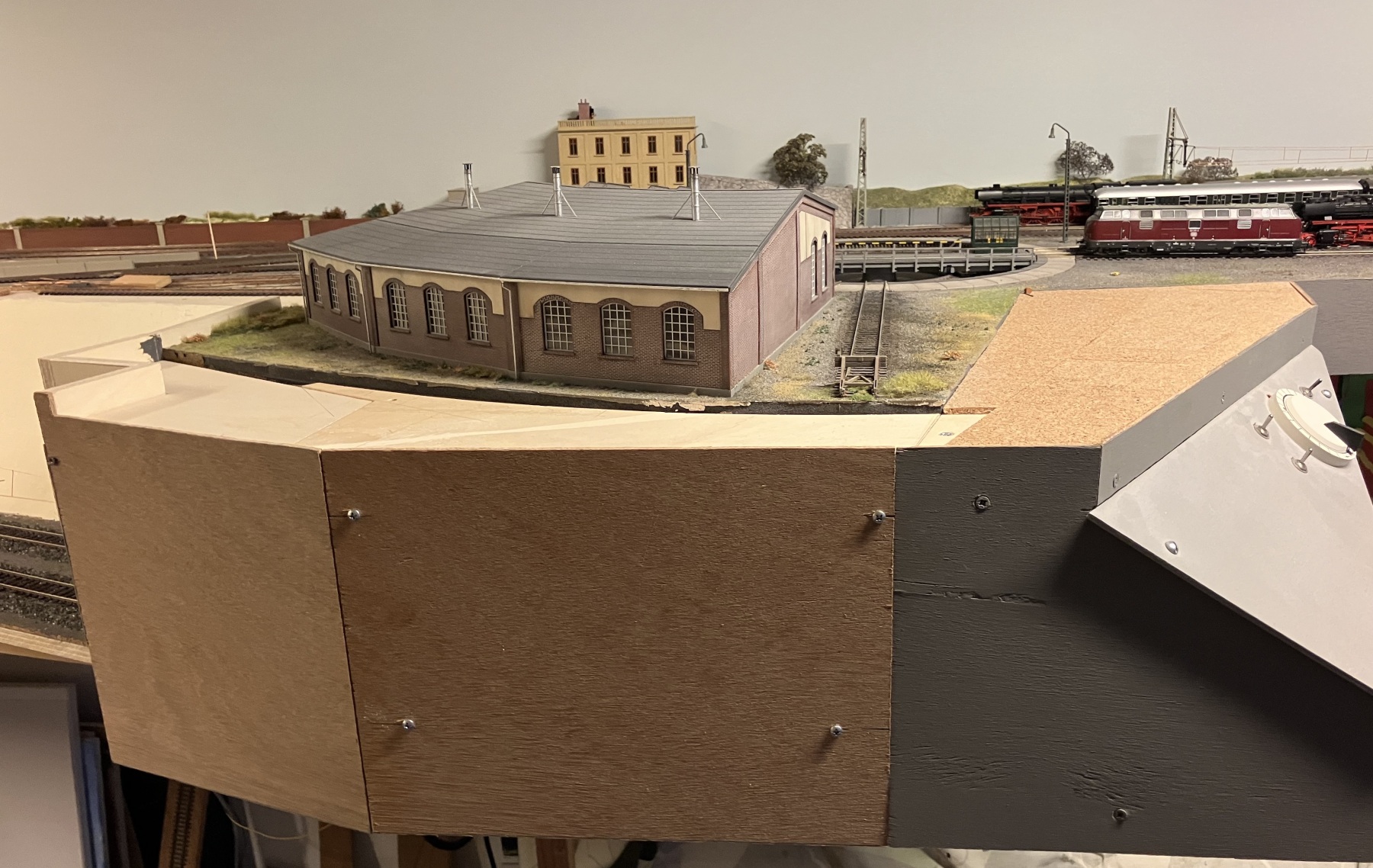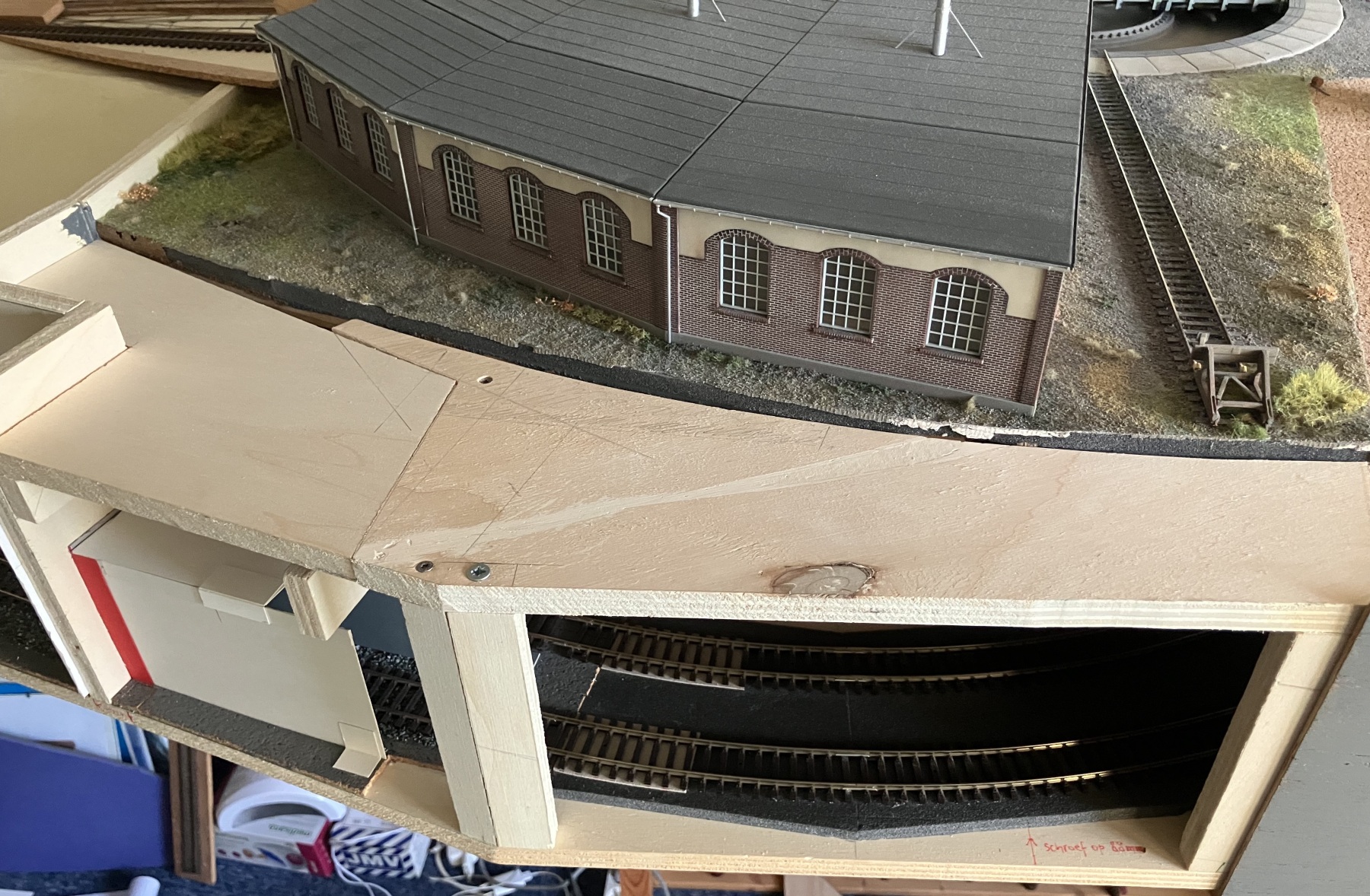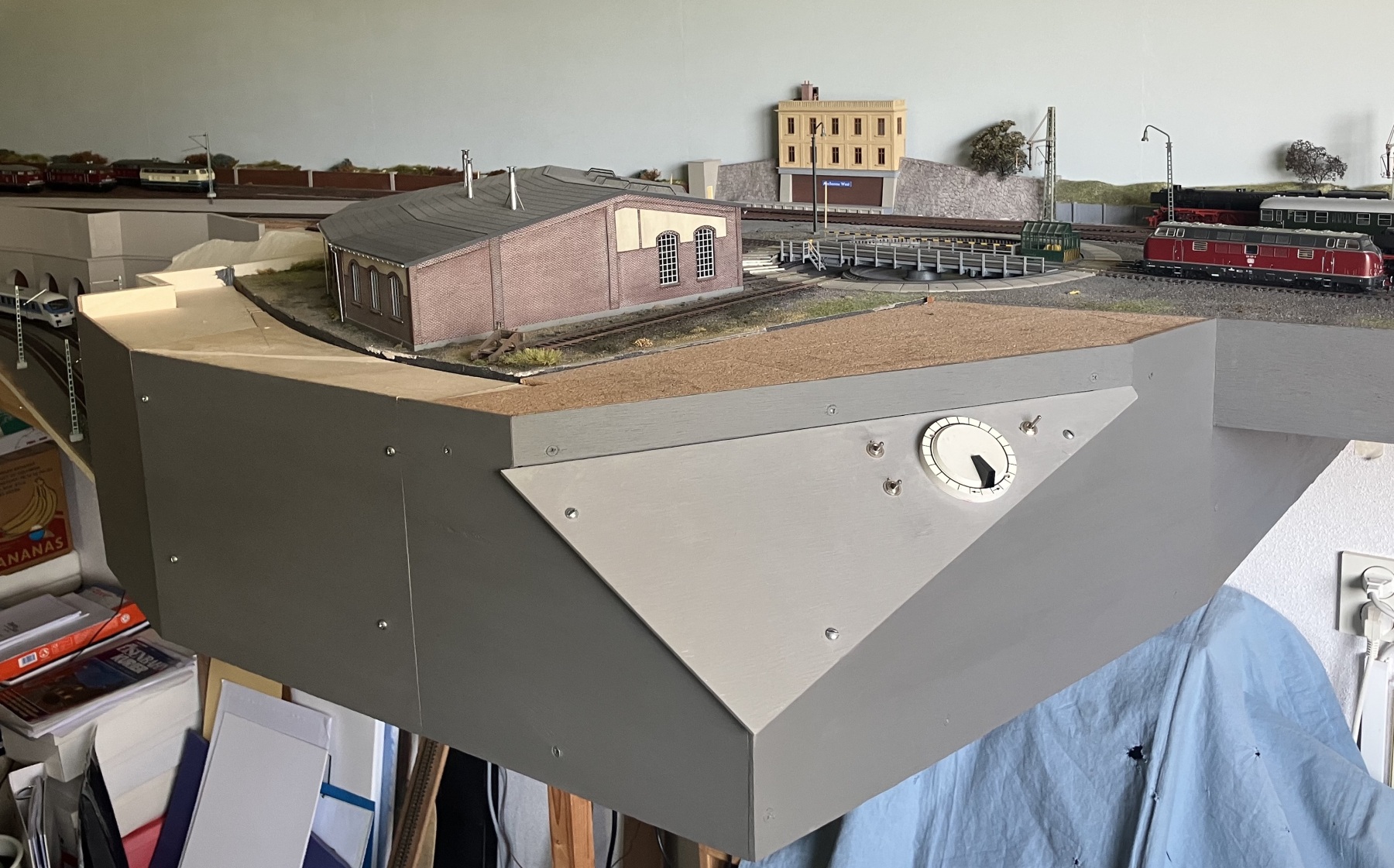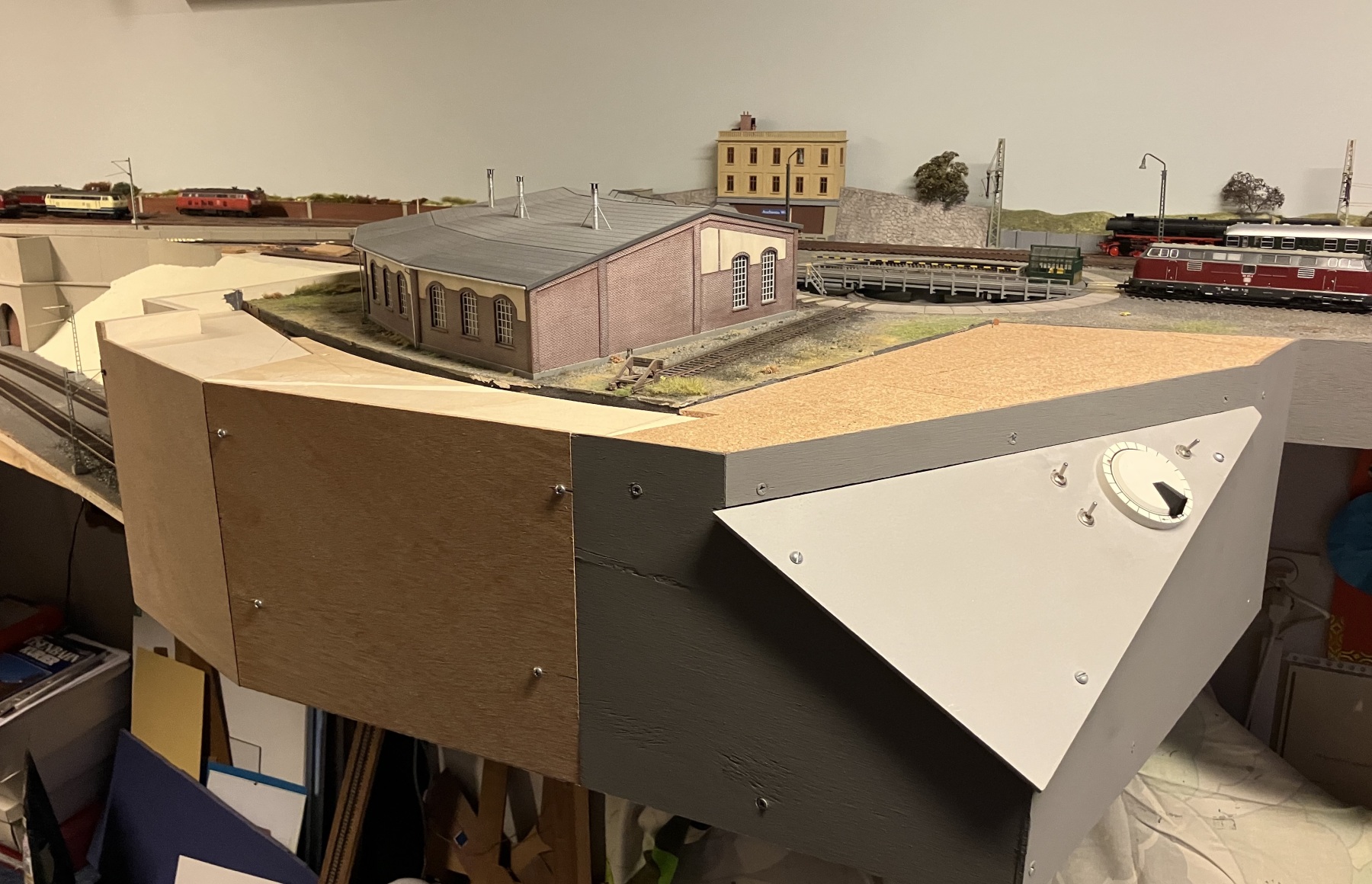 Dank allen.De zijpanelen in de verf gezetBehalve dat is er nu ook een paneel geplaatst naar de muur, rechts op de foto.Het rondlopende spoor wordt daarmee afgeschermd, zodat het niet onmiddellijk zichtbaar is.Groet, BasTerzijde.Ik heb het ooit een keer meegemaakt dat er bij en demonstratie aan niet-hobbyisten iets dusdanig misging, dat ik van onderaf bij de baan moest.Vanaf dat moment zat mijn publiek alleen maar gehurkt onder de baan te kijken. Irritant .Het lijkt wel of men liever naar "the making of" kijkt dan naar "de voorstelling zelf". Aan mede-hobbyisten laat ik overigens wèl graag zien hoe alles in elkaar steekt, voor degene die daar althans in geïnteresseerd is