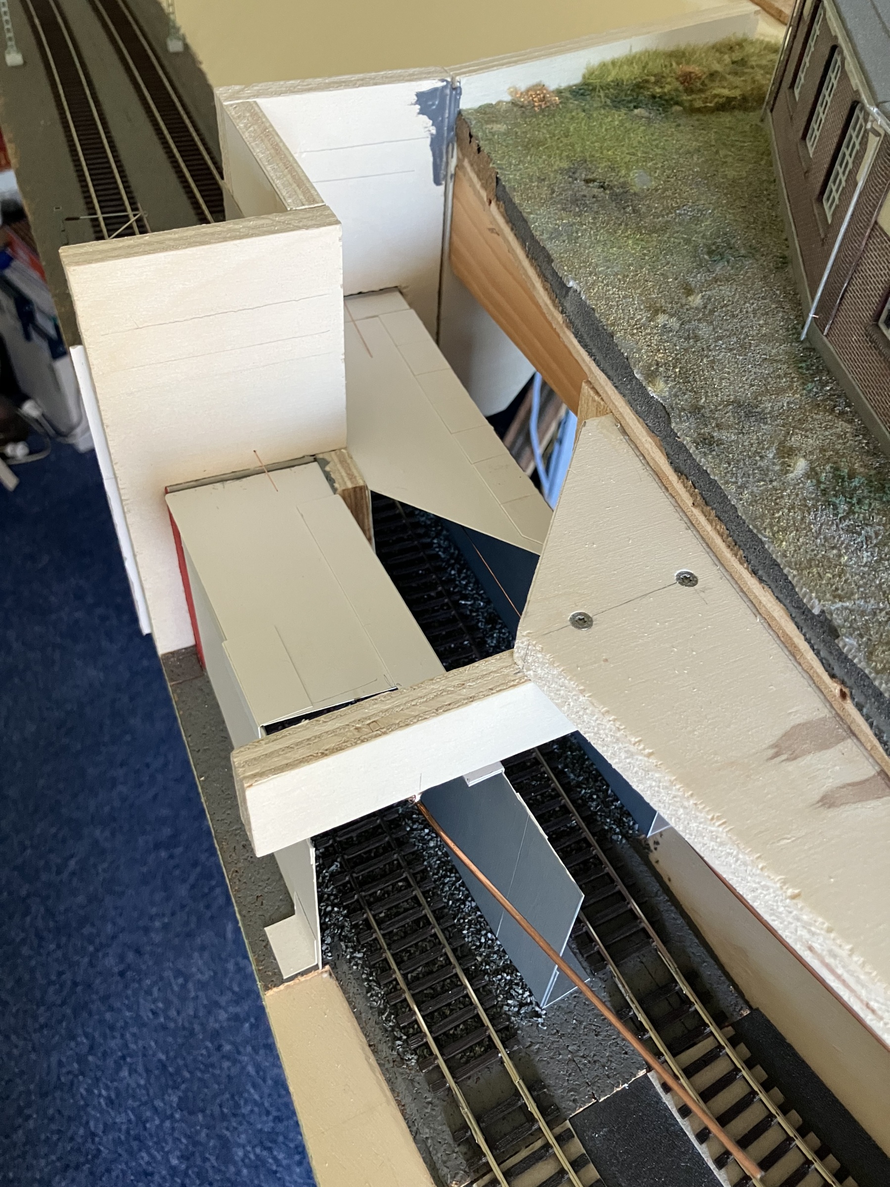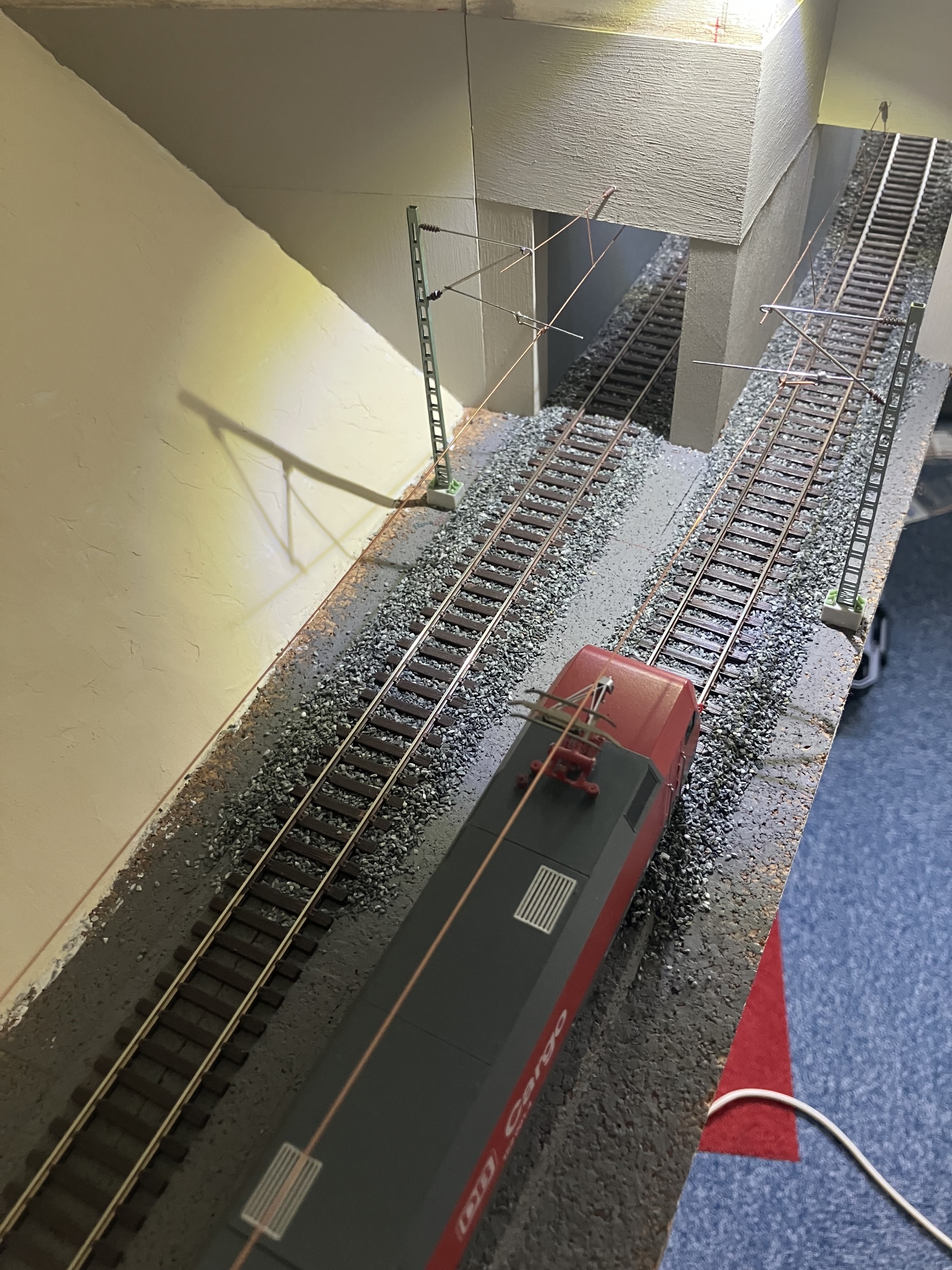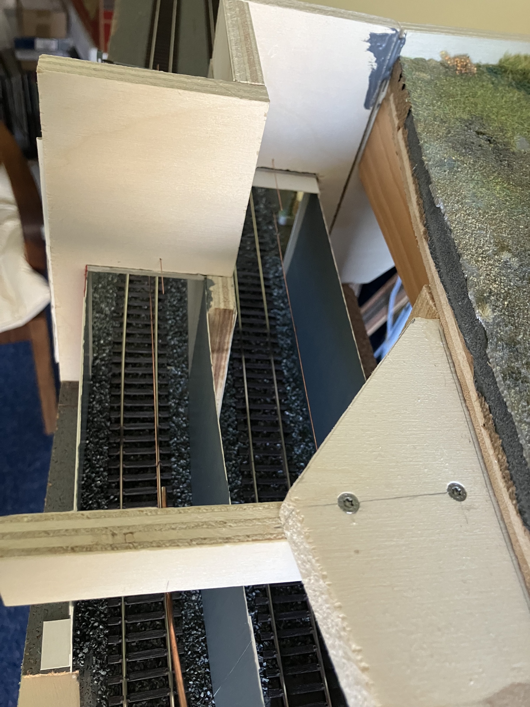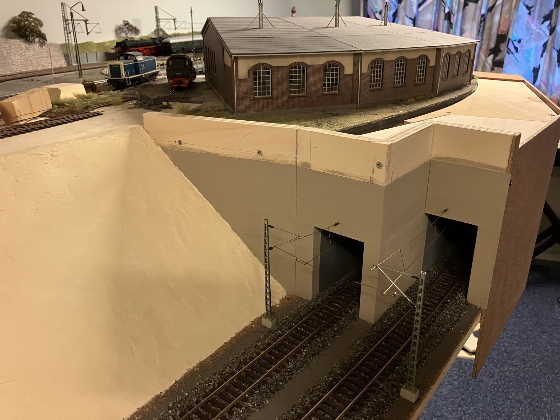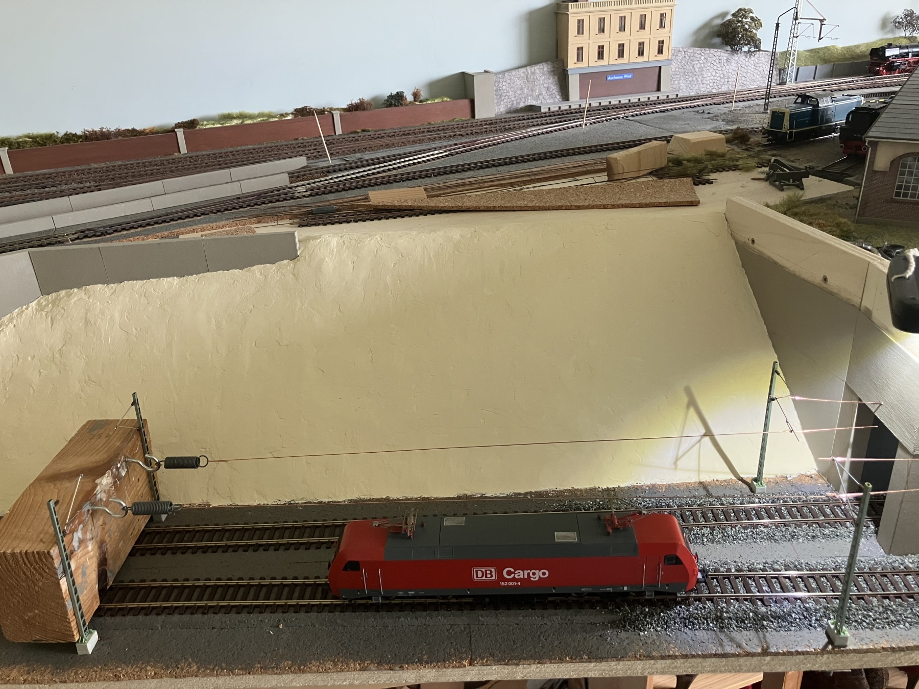 Dank allen.De zijpanelen in de verf gezetBehalve dat is er nu ook een paneel geplaatst naar de muur, rechts op de foto.Het rondlopende spoor wordt daarmee afgeschermd, zodat het niet onmiddellijk zichtbaar is.Groet, BasTerzijde.Ik heb het ooit een keer meegemaakt dat er bij en demonstratie aan niet-hobbyisten iets dusdanig misging, dat ik van onderaf bij de baan moest.Vanaf dat moment zat mijn publiek alleen maar gehurkt onder de baan te kijken. Irritant .Het lijkt wel of men liever naar "the making of" kijkt dan naar "de voorstelling zelf". Aan mede-hobbyisten laat ik overigens wèl graag zien hoe alles in elkaar steekt, voor degene die daar althans in geïnteresseerd is