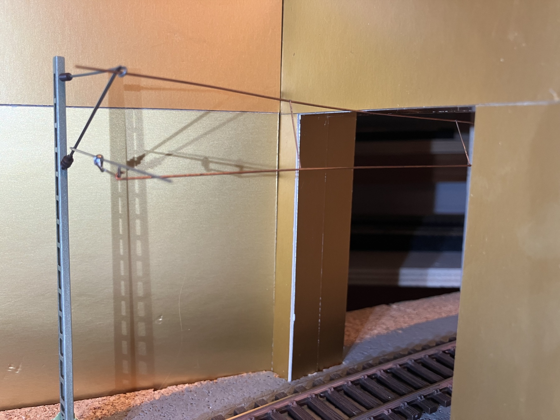 Het tunnelportaal is hier even verwijderd en vervolgens is een stukje bovenleidingdraad aangebracht.