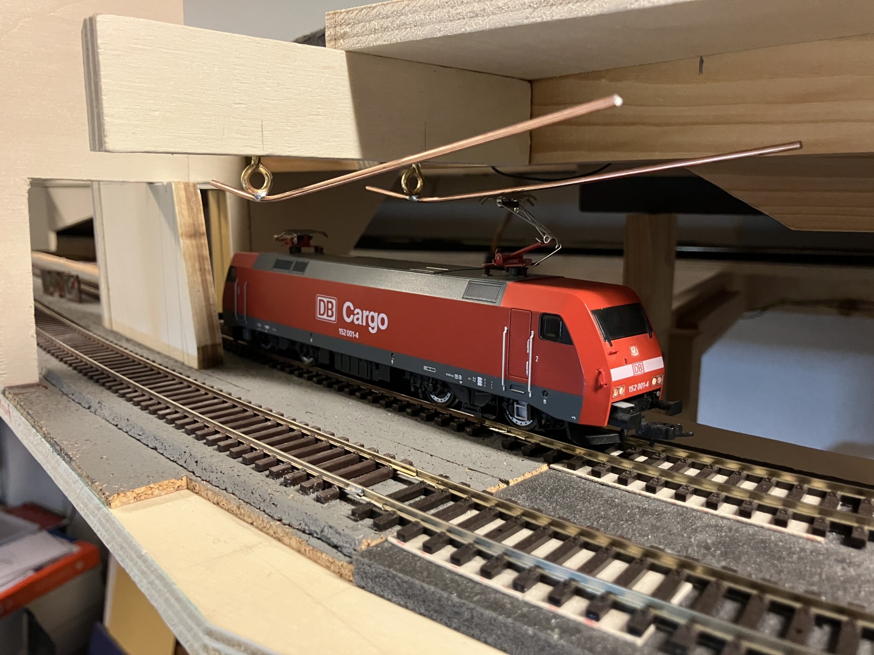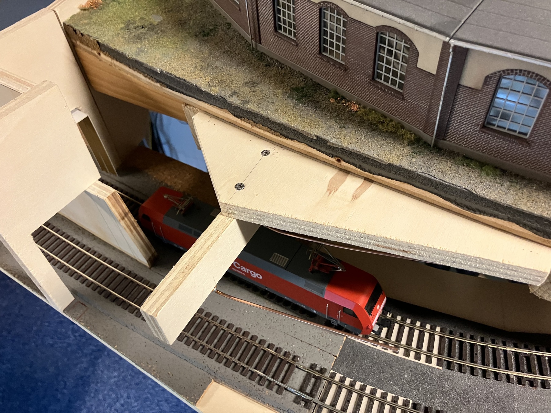Ik heb 2 willekeurige rijtuigen van 26,4m schaal 1/87 gebruikt om te testen of de portalen ver genoeg naar voren staan. Als de portalen namelijk te kort op de verborgen krappe boog staan, zie je de rijtuigen al uitzwaaien voor ze het portaal gepasseerd zijn. Dat ziet er niet uit (vind ik). Het verstoort de illusie dat de sporen ongeveer in de dezelfde lijn doorgaan.