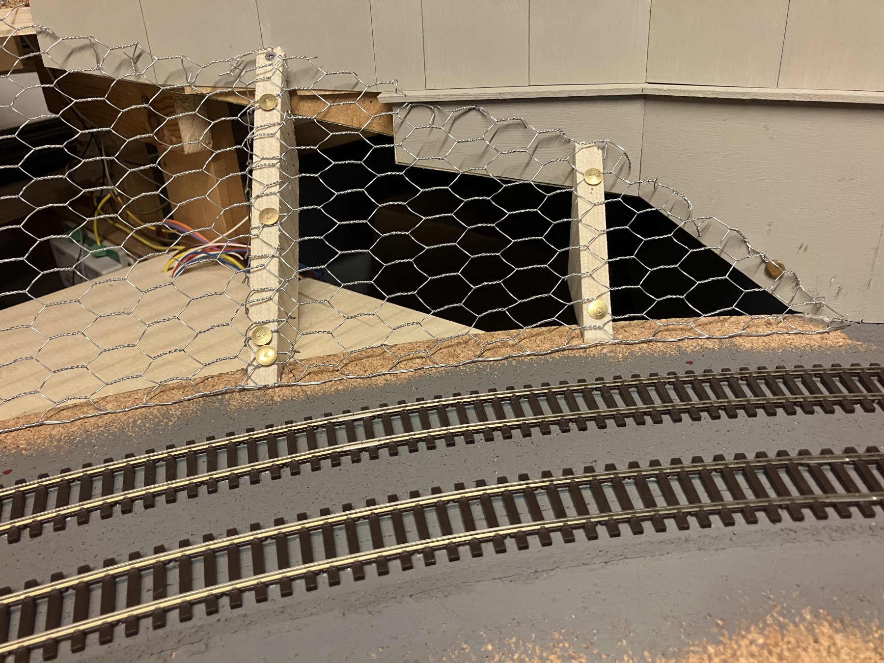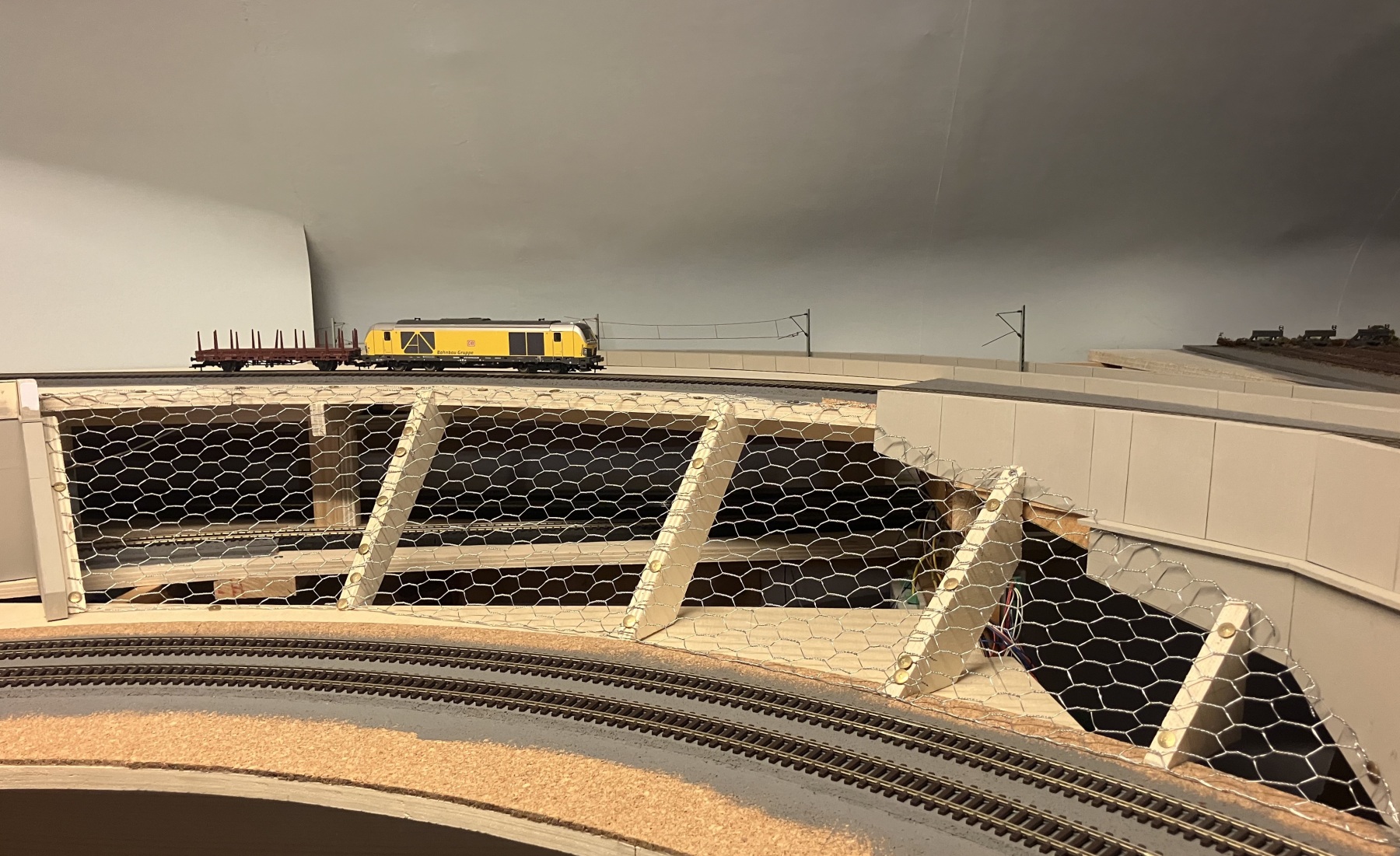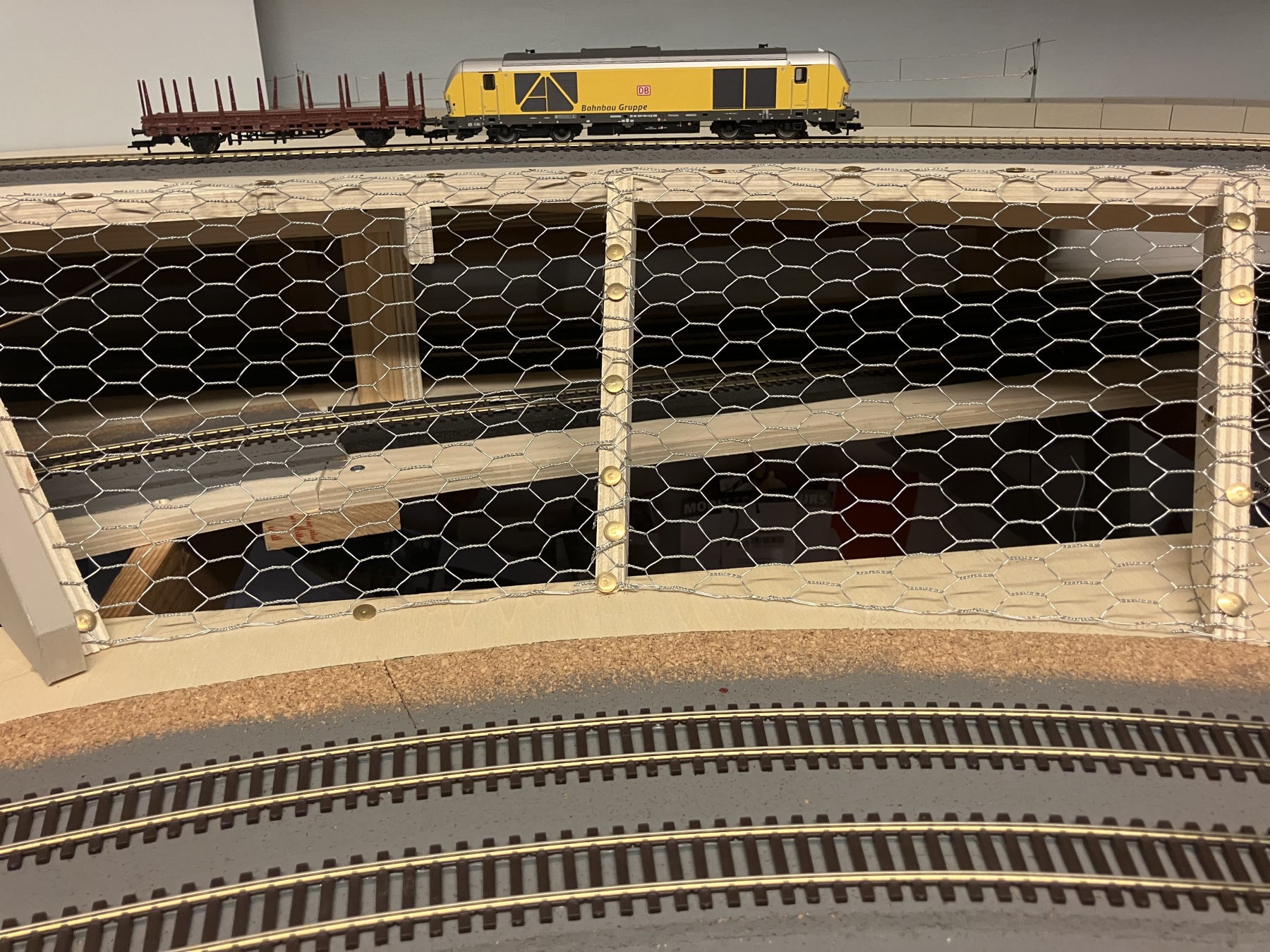 Wat me opvalt aan de bovenrand, waar de locomotief staat, is dat het gaas zich al op maaiveldhoogte lijkt te bevinden. Als dadelijke de afwerking er overheen is, is er dan nog iets te zien van de railbedding? Het kan natuurlijk aan vertekening op de foto liggen.